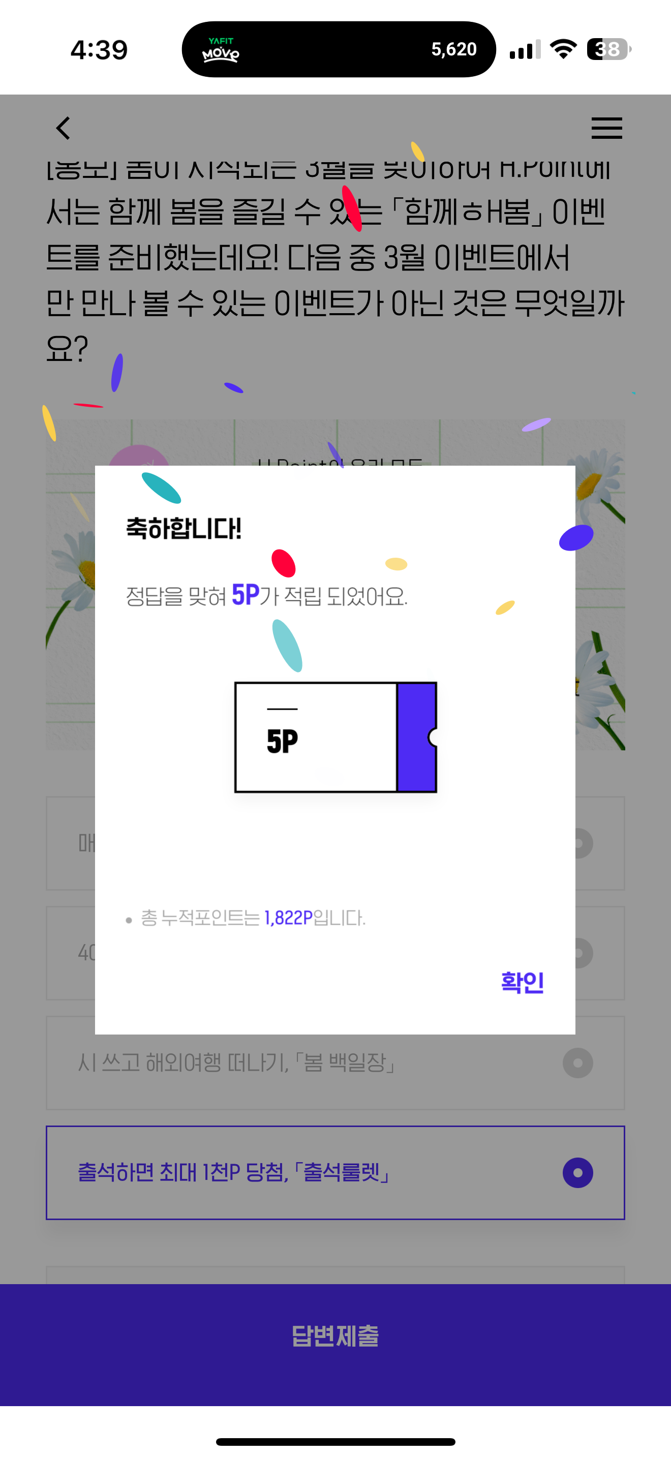 H포인트 퀴즈 정답은 출석하면 최대 1천P 당첨. 출석룰렛 입니다