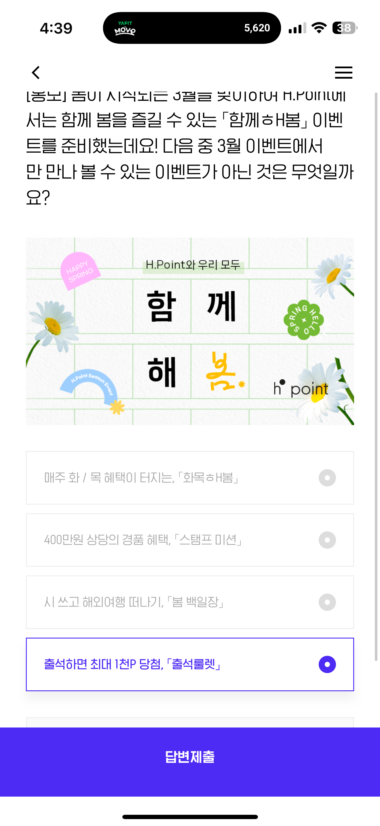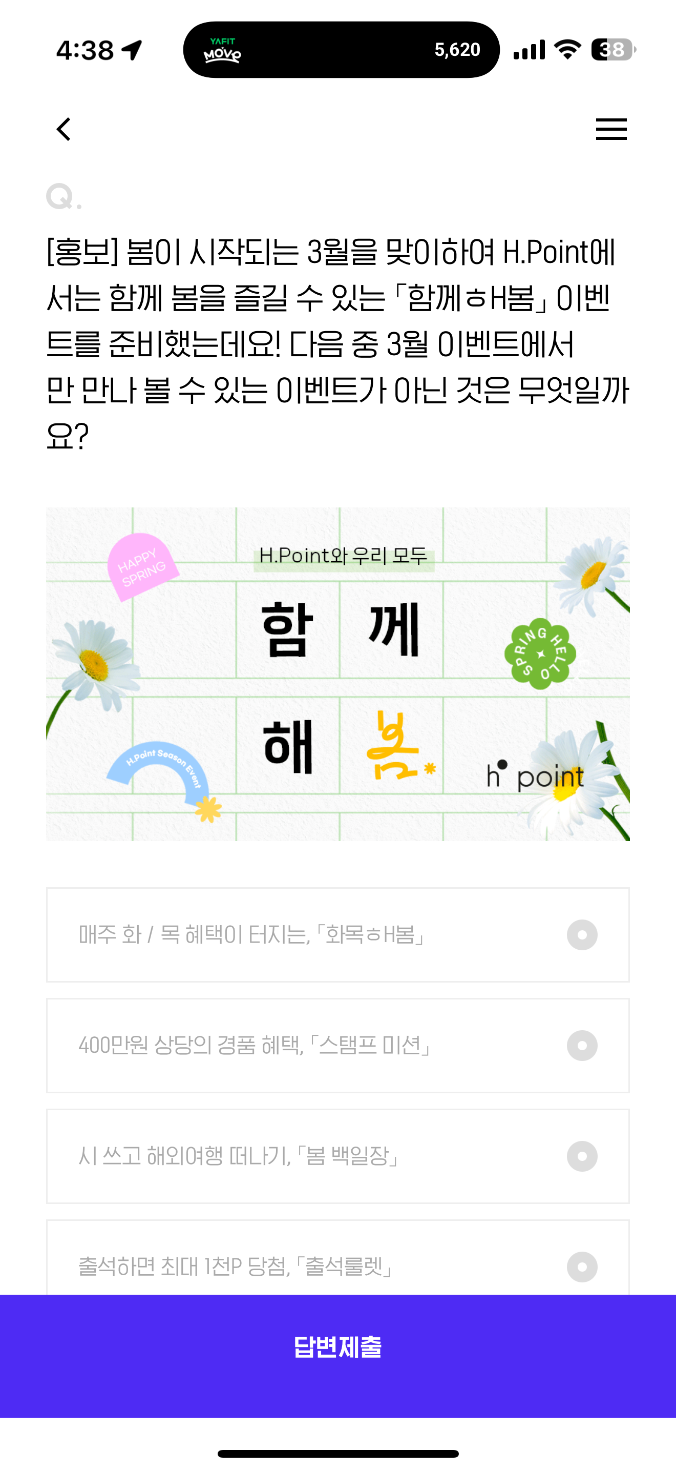 봄이 시작되는 3월을 맞이하여 H.Point에서는 함께 봄을 즐길 수 있는 함께ㅎㅐ봄 이벤트를 준비했는데요! 다음 중 3월 이벤트에서 만나 볼 수 있는 이벤트가 아닌 것은 무엇일까요? 보기는 1. 매주 화/목 혜택이 터지는 화목ㅎㅐ봄 2. 400만원 상당의 경품 혜택, 스탬프 미션 3. 시 쓰고 해외여행 떠나기, 봄 백일장 4. 출석하면 최대 1천P 당첨, 출석룰렛 입니다
