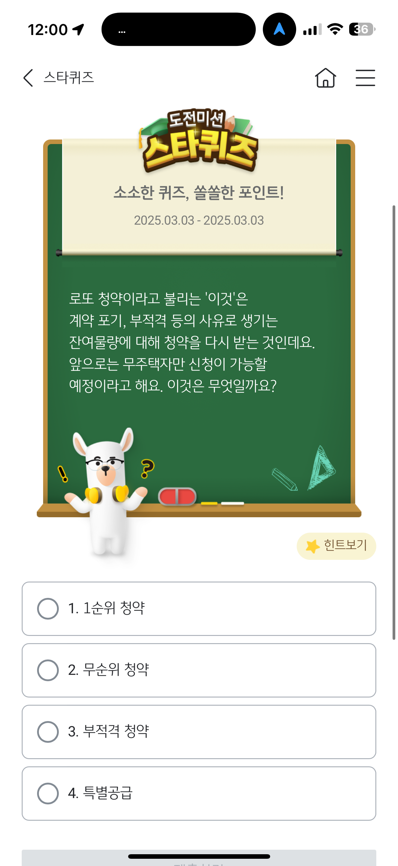 KB스타뱅킹 스타퀴즈 정답은 2. 무순위 청약 입니다