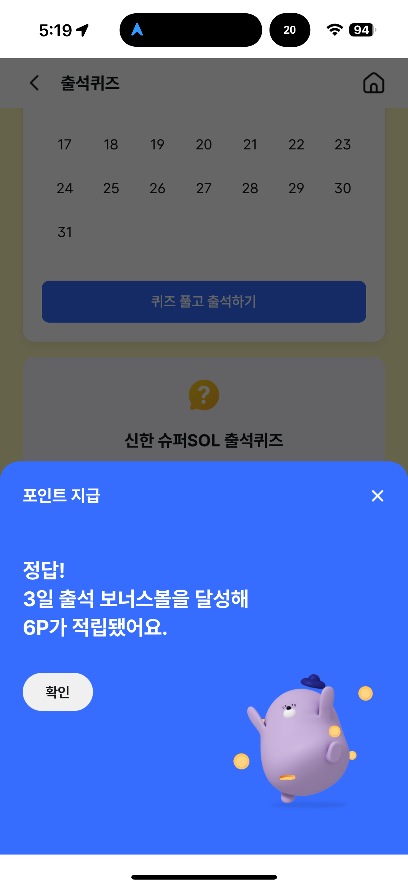 신한 슈퍼SOL 출석퀴즈 정답은 2명 입니다
