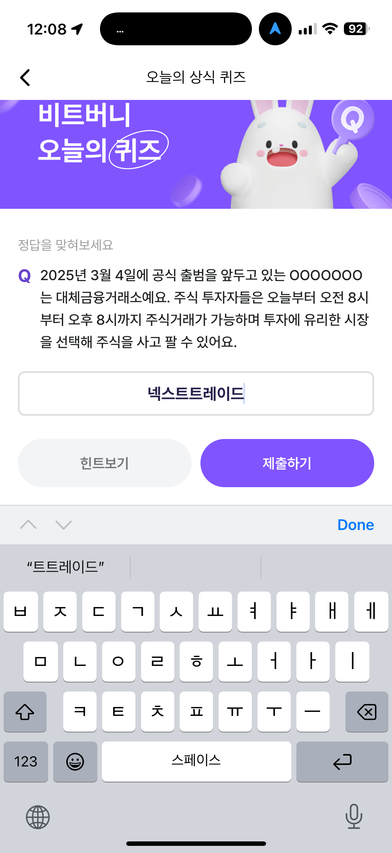 비트버니 오늘의 퀴즈 정답은 넥스트트레이드 입니다