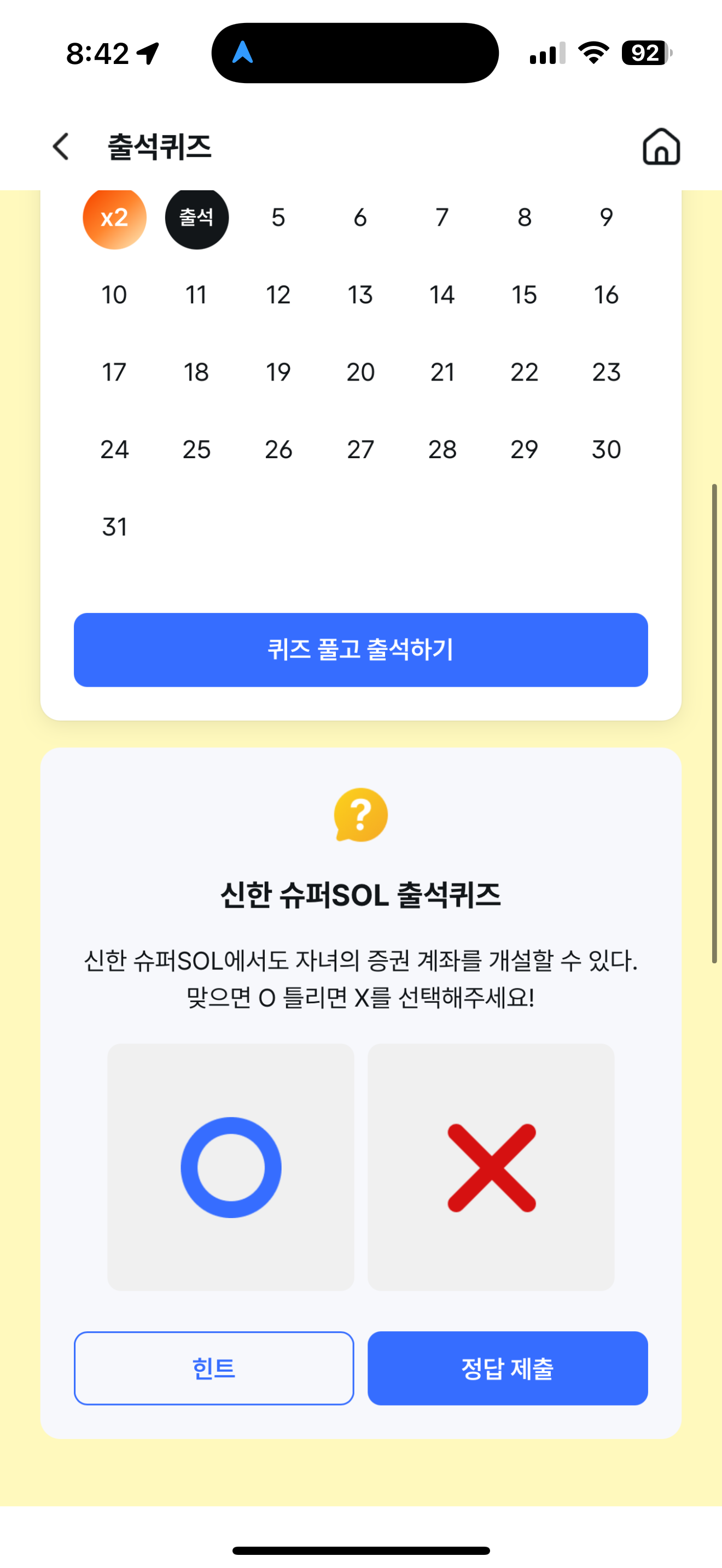 신한 슈퍼SOL 출석퀴즈 정답은 O 입니다
