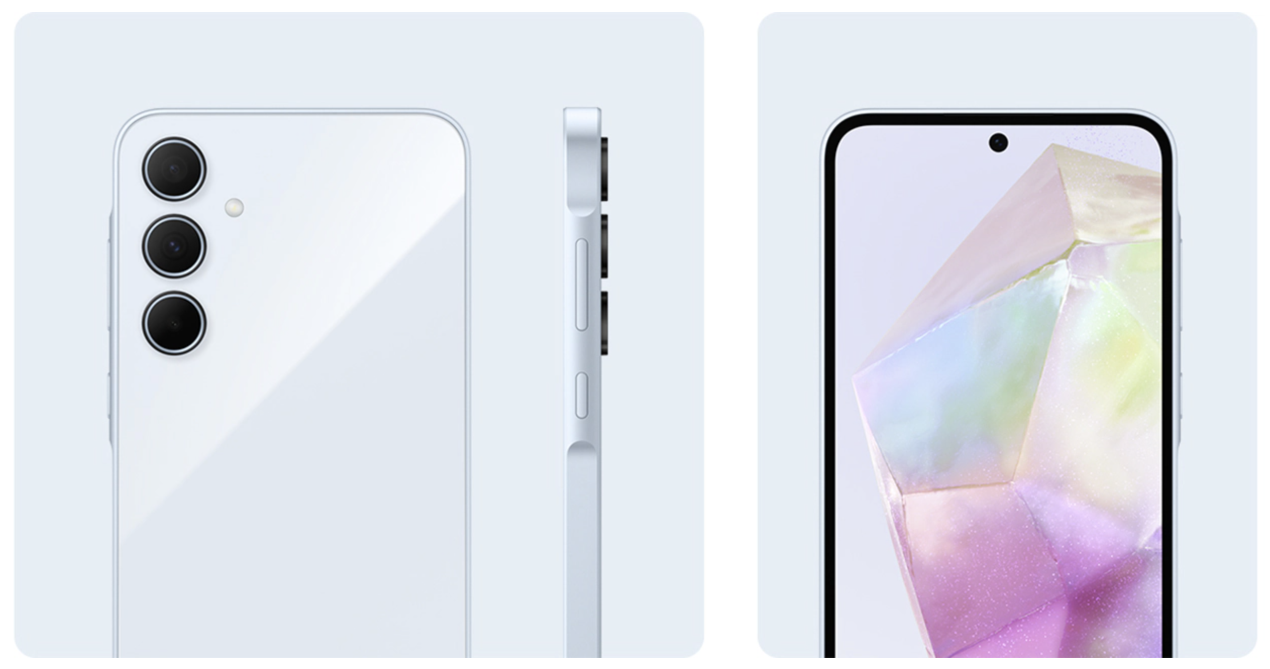 삼성 갤럭시 A35 디자인은 전체적으로 플래그십 스마트폰과 크게 다르지 않은 디자인을 가지고 있습니다. 그냥 봐서는 삼성 갤럭시S24 시리즈라고 해도 모를 정도로 흡사합니다. 보급형 스마트폰이지만 디자인 경쟁력 만큼은 프리미엄 스마트폰과 차이가 없다는게 삼성 갤럭시 A35의 매력입니다.