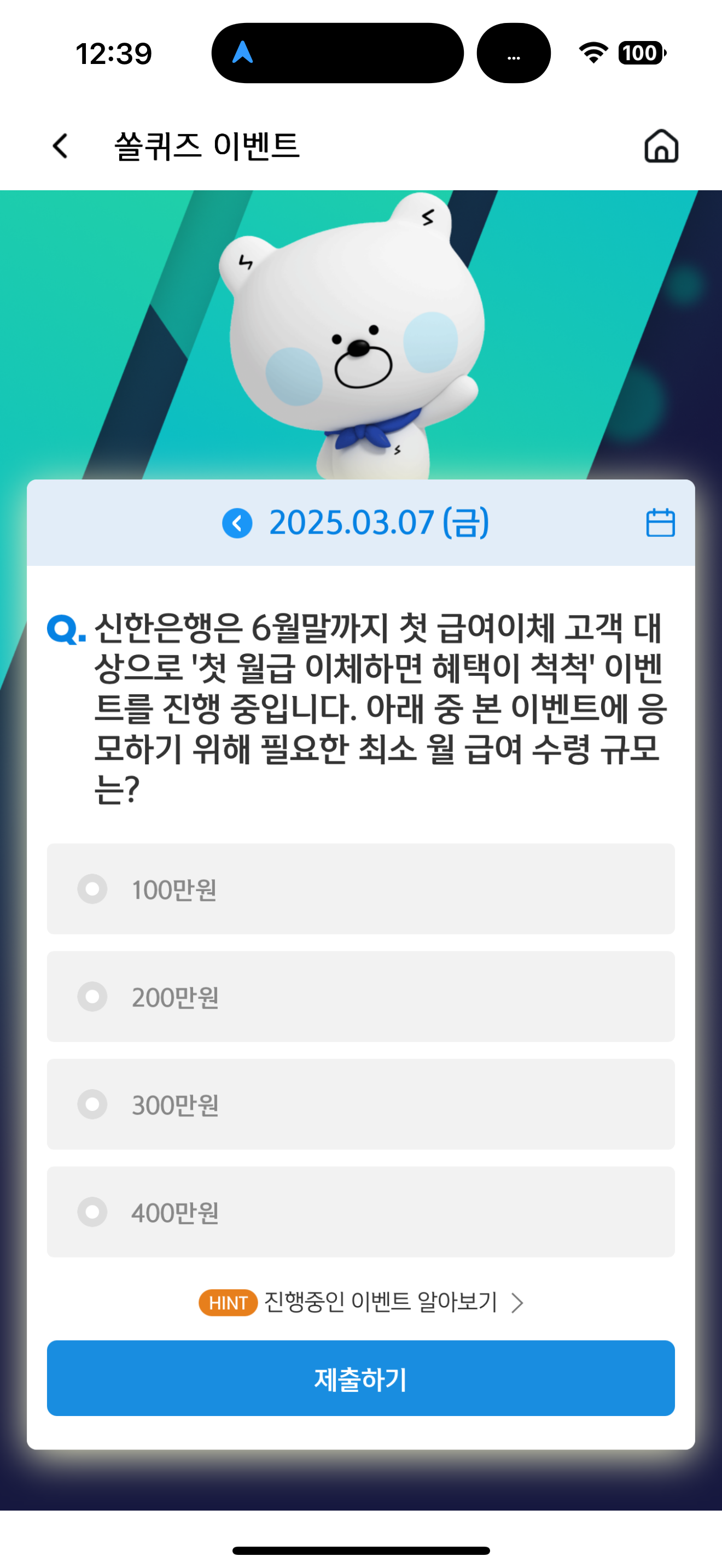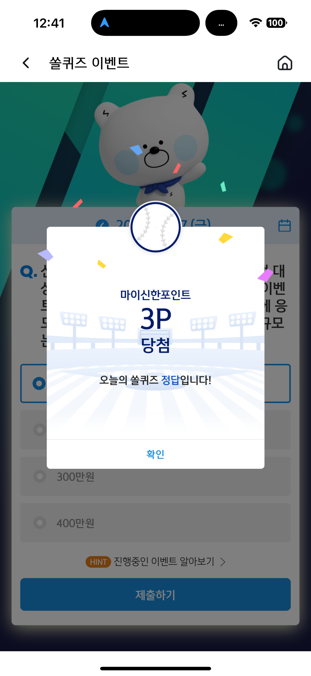 신한 슈퍼SOL 야구/상식 쏠퀴즈 정답은 100만원 입니다