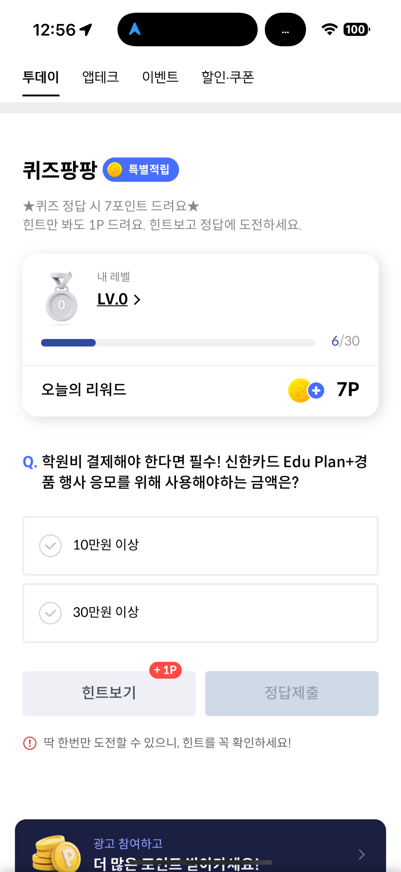 신한카드 퀴즈팡팡 정답은 10만원 이상 입니다