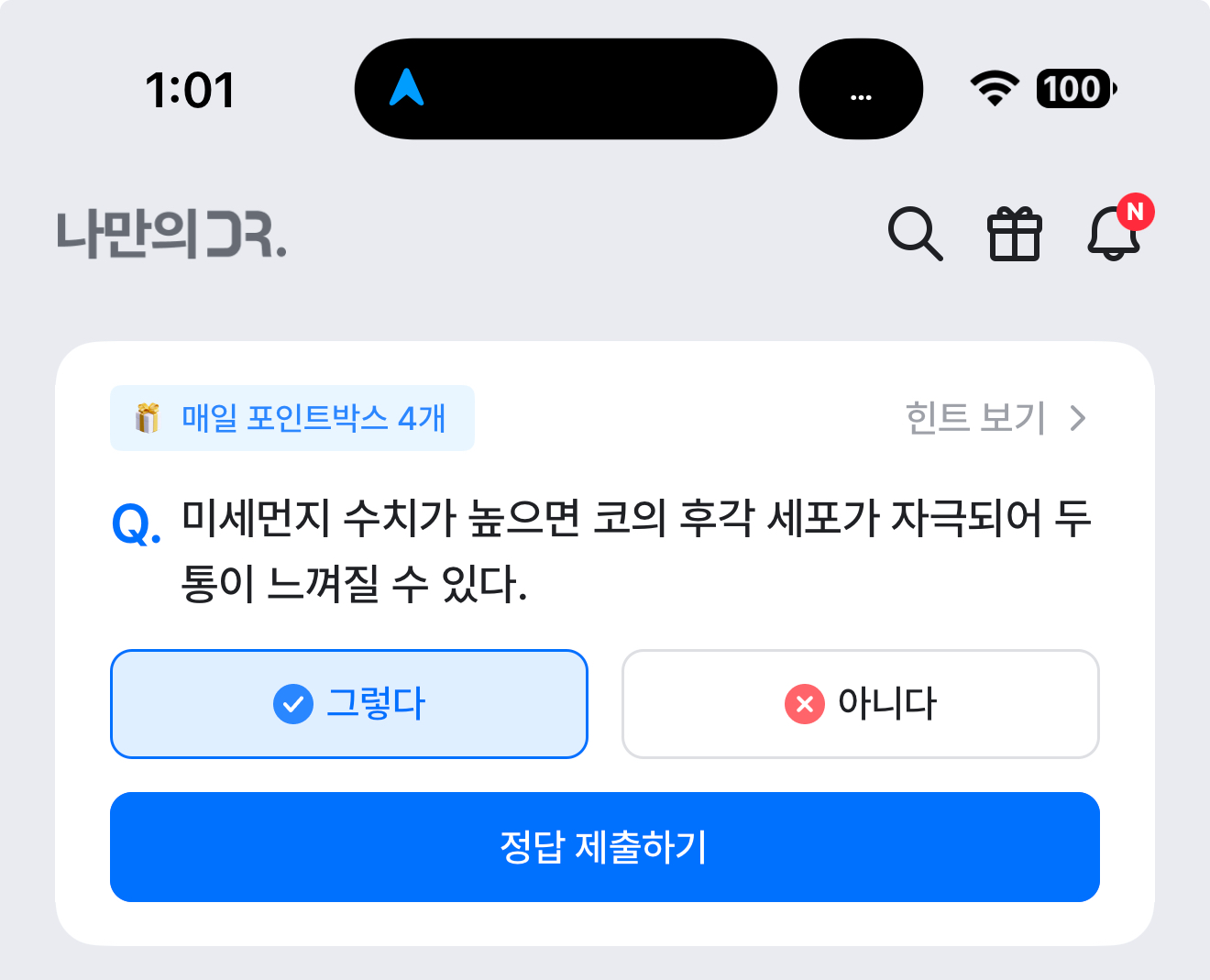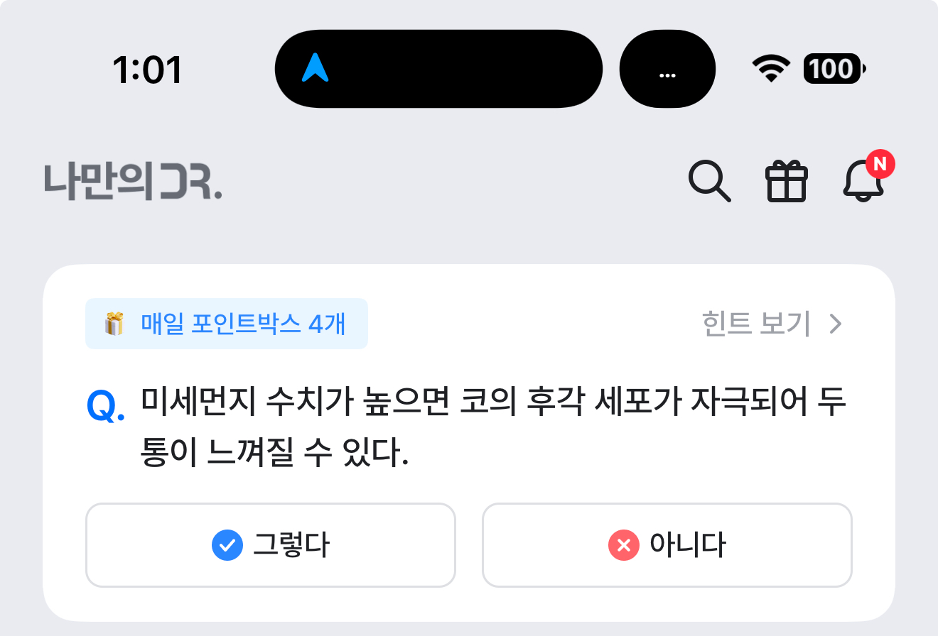 나만의 닥터 퀴즈 3월 7일 정답(미세먼지 수치가 높으면 코의 후각 세포가 자극되어 두통이 느껴질 수 있다)