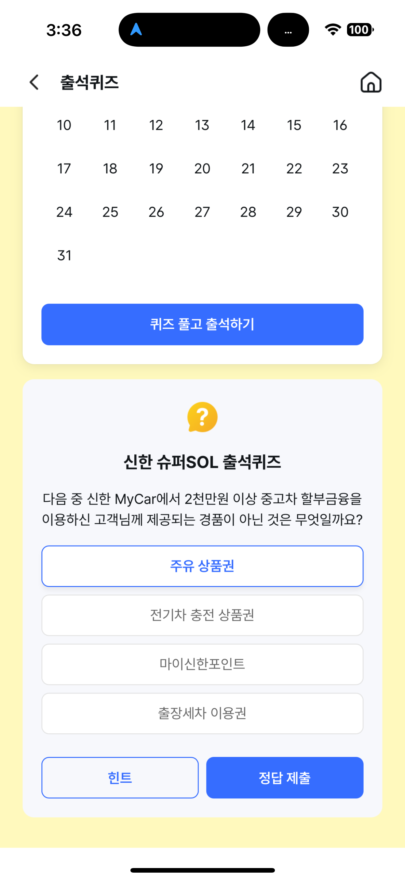 신한 슈퍼SOL 출석퀴즈 정답은 주유 상품권 입니다