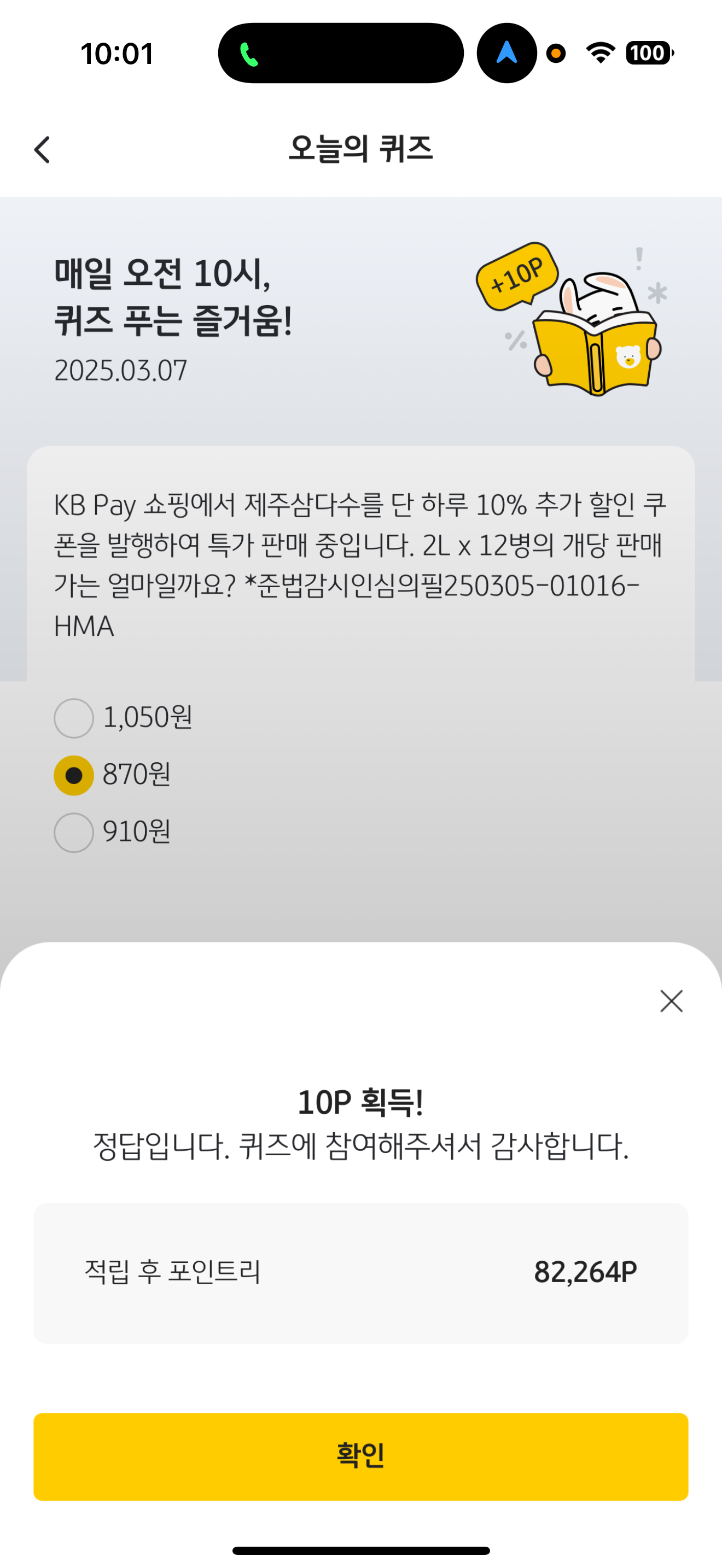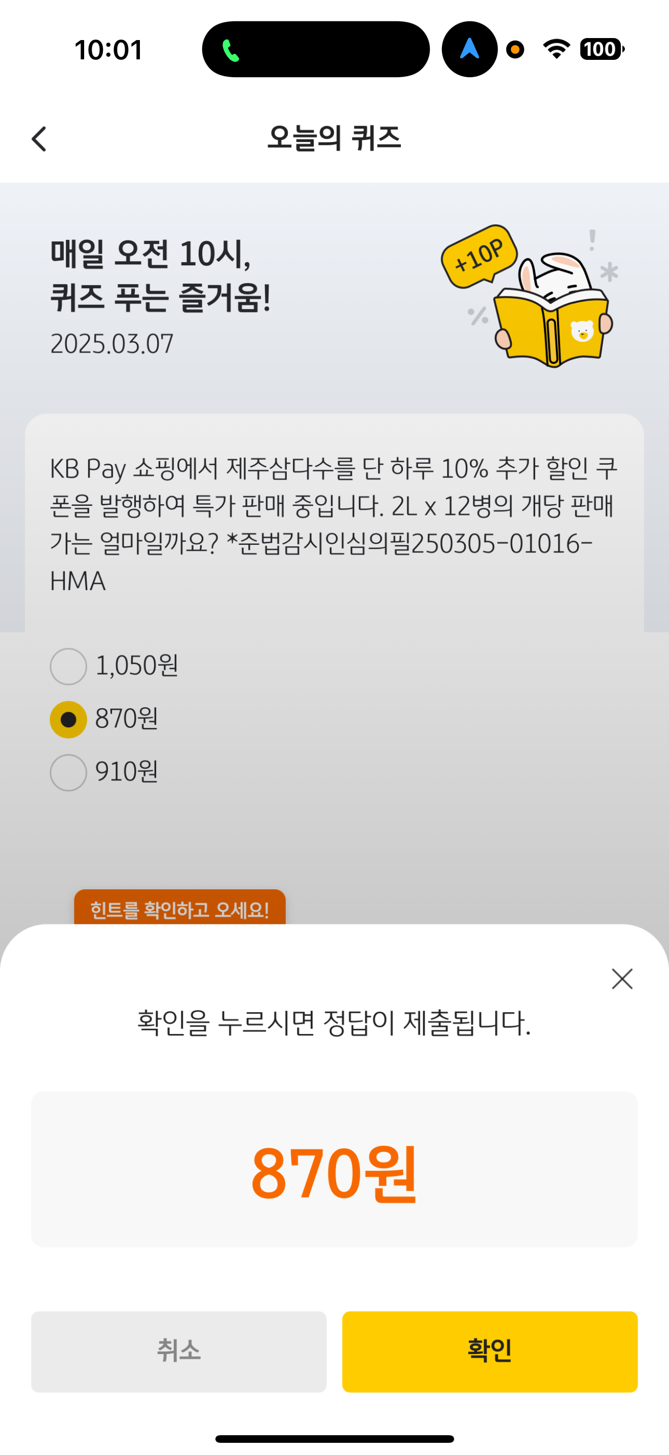 KB pay 오늘의 퀴즈 정답은 870원 입니다.