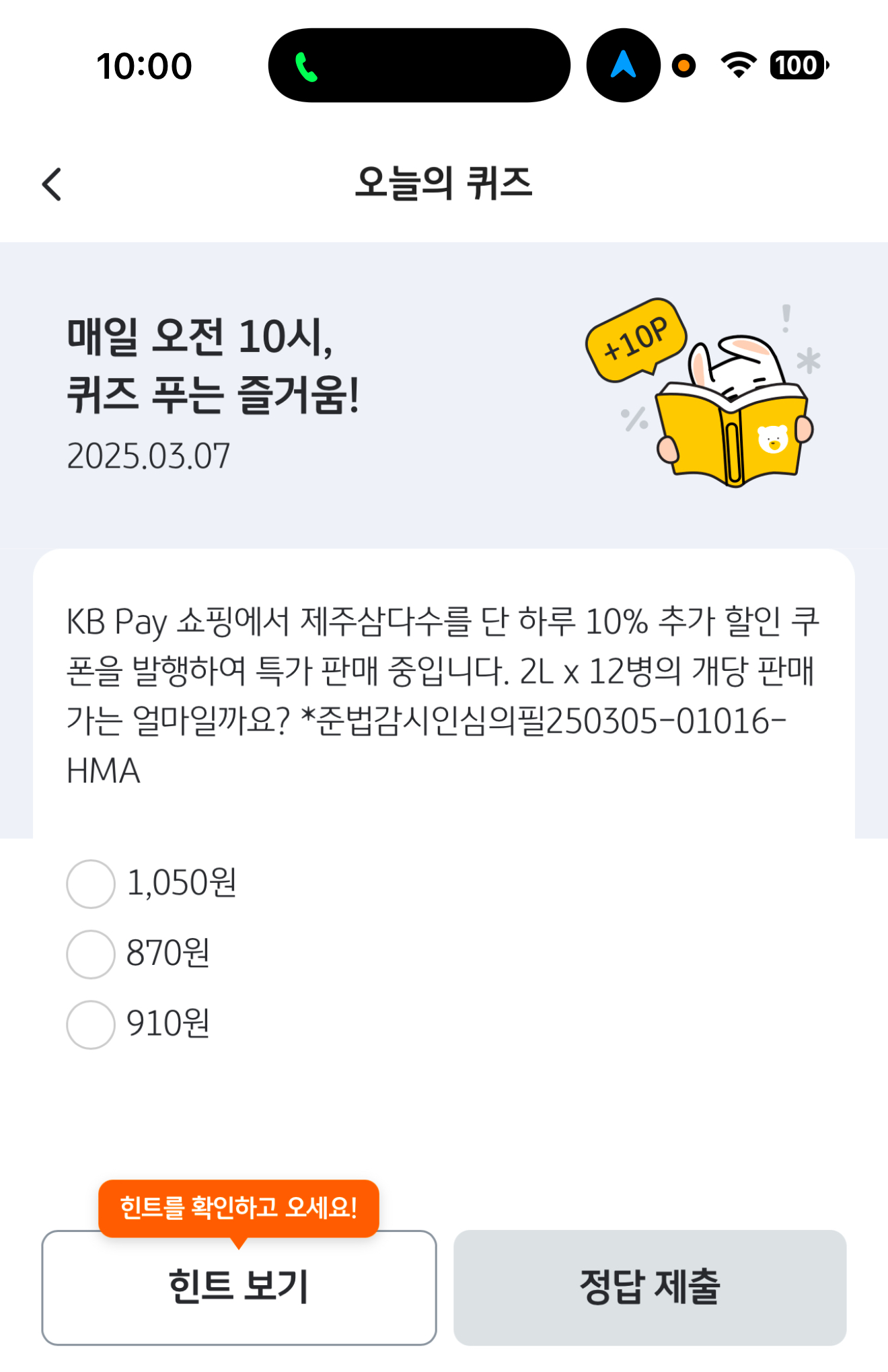 KB Pay 쇼핑에서 제주삼다수를 단 하루 10% 추가 할인 쿠폰을 발행하여 특가 판매 중입니다. 2L x 12병의 개당 판매가는 얼마일까요? *준법감시인심의필250305-01016-HMA 보기는 1. 1,050원 2. 870원 3. 910원 입니다. 저렴하게 판매하니 잘 참고해 보세요
