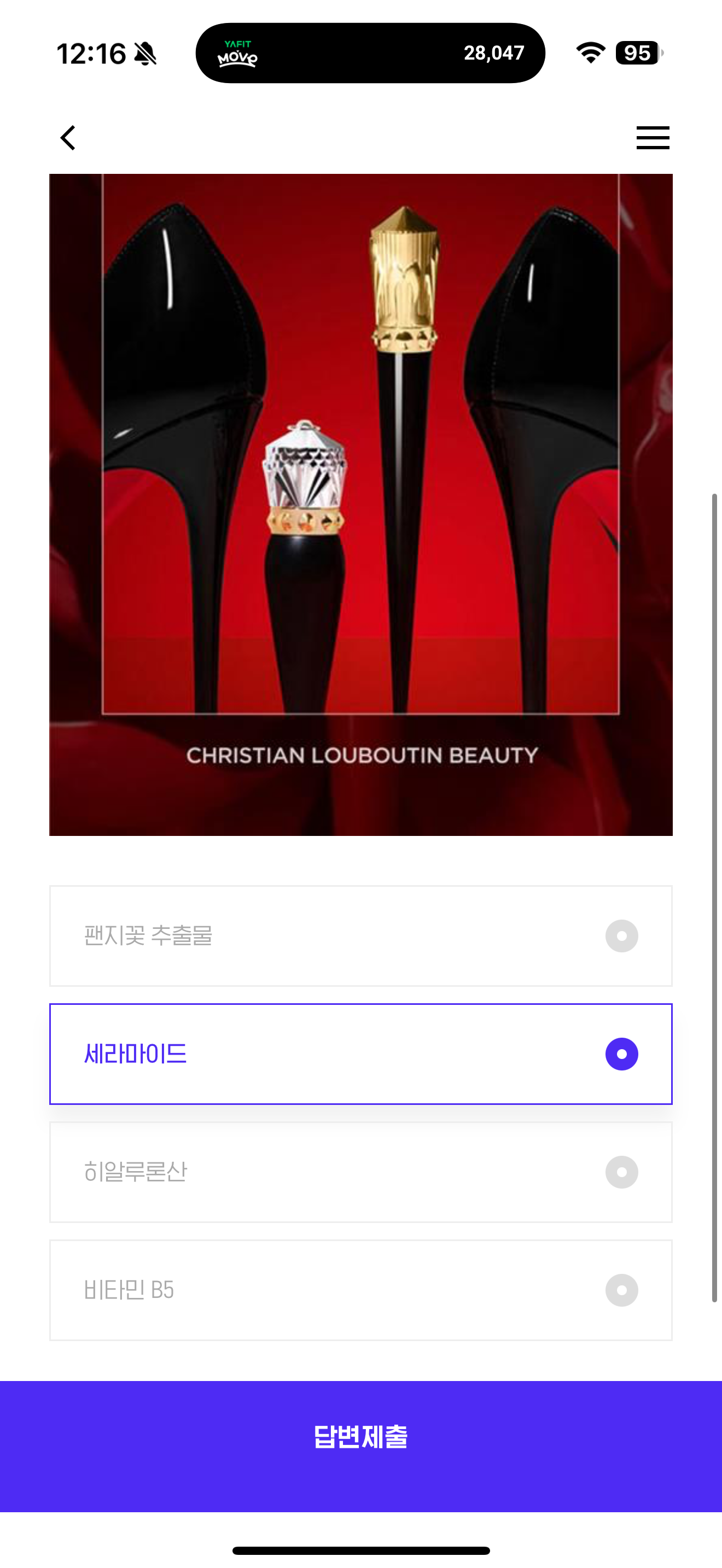 현대면세점에서 크리스찬 루부탱 쿠션 사은품 증정 부터 클리어런스 세일까지 다채롭게 준비했어요! 루부탱의 베스트 상품, 건조하지 않은 커버력을 선사하는 벨벳 매트 립스틱의 ' 대표성분 ' 이 아닌 것은 무엇일까요~? 보기는 1. 팬지꽃 추출물 2. 세라마이드 3. 히알루론산 4. 비타민 B5 입니다