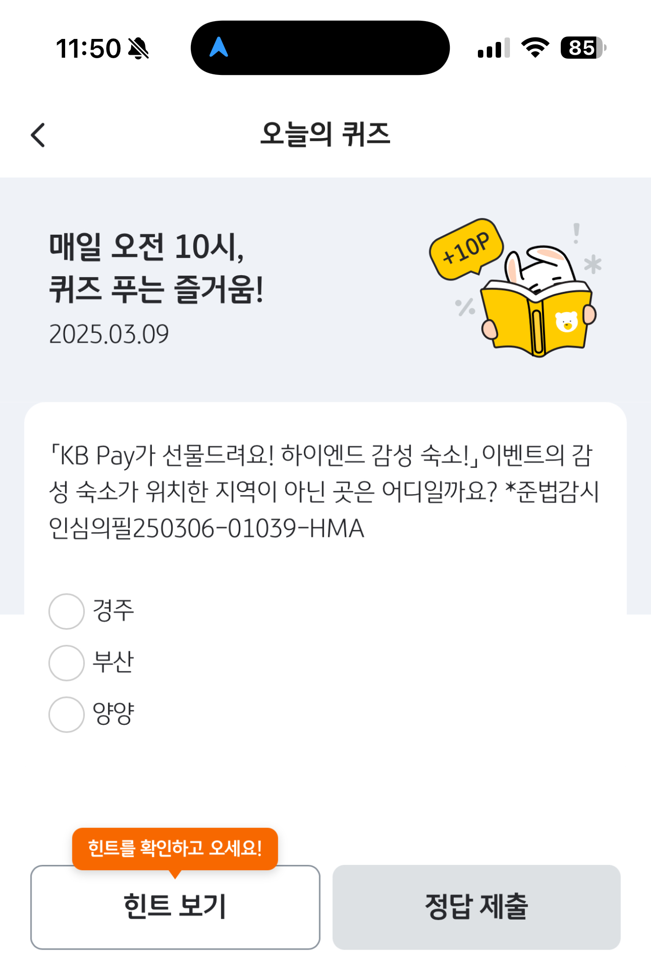 KB Pay 오늘의 퀴즈 정답은 부산 입니다