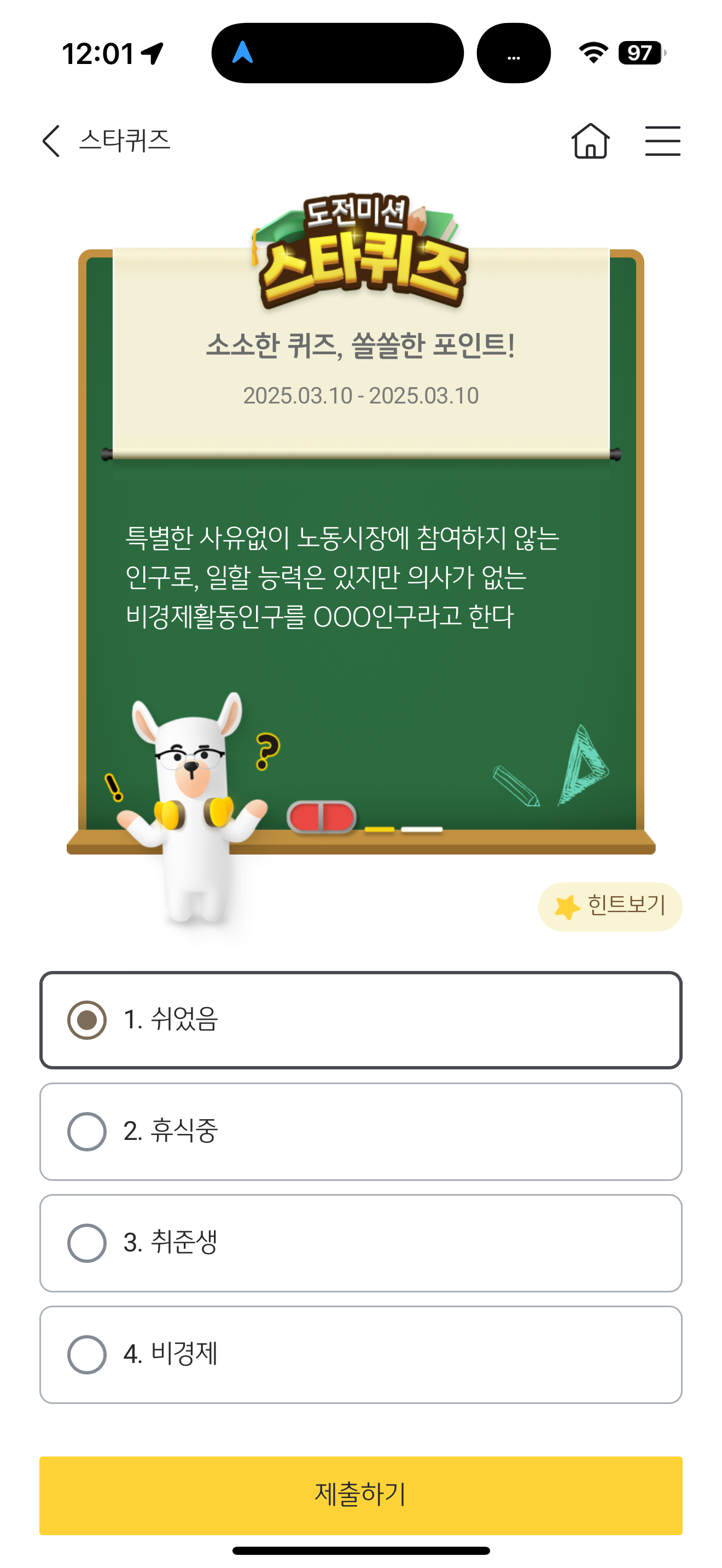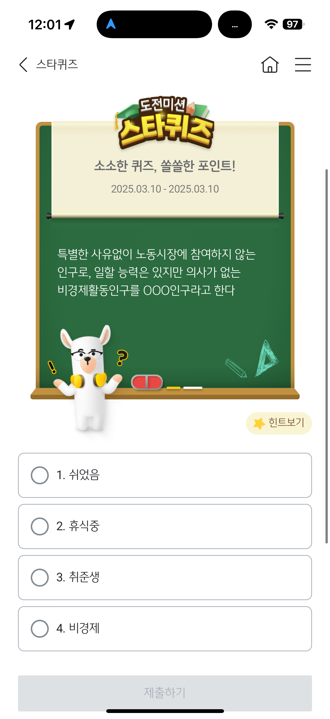 특별한 사유없이 노동시장에 참여하지 않는 인구로, 일할 능력은 있지만 의사가 없는 비경제활동인구를 OOO인구라고 한다 보기는 1. 쉬었음 2. 휴식중 3. 취준생 4. 비경제 입니다. 노동시장에 참여하지 않는 인구를 구분하는데 설마 이런게 정답이라고 생각할 정도로 독특합니다