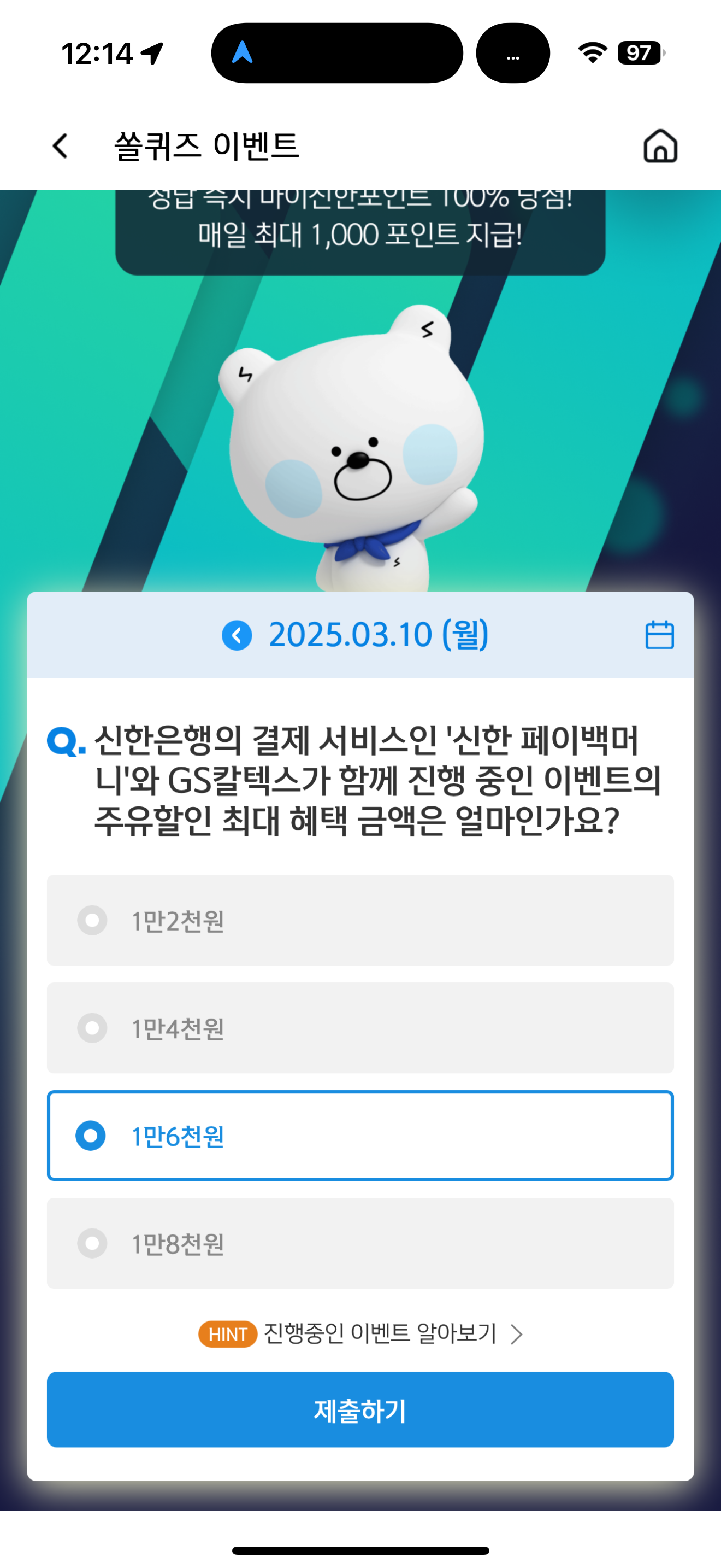 신한 슈퍼SOL 야구/상식 쏠퀴즈 정답은 1만6천원 입니다