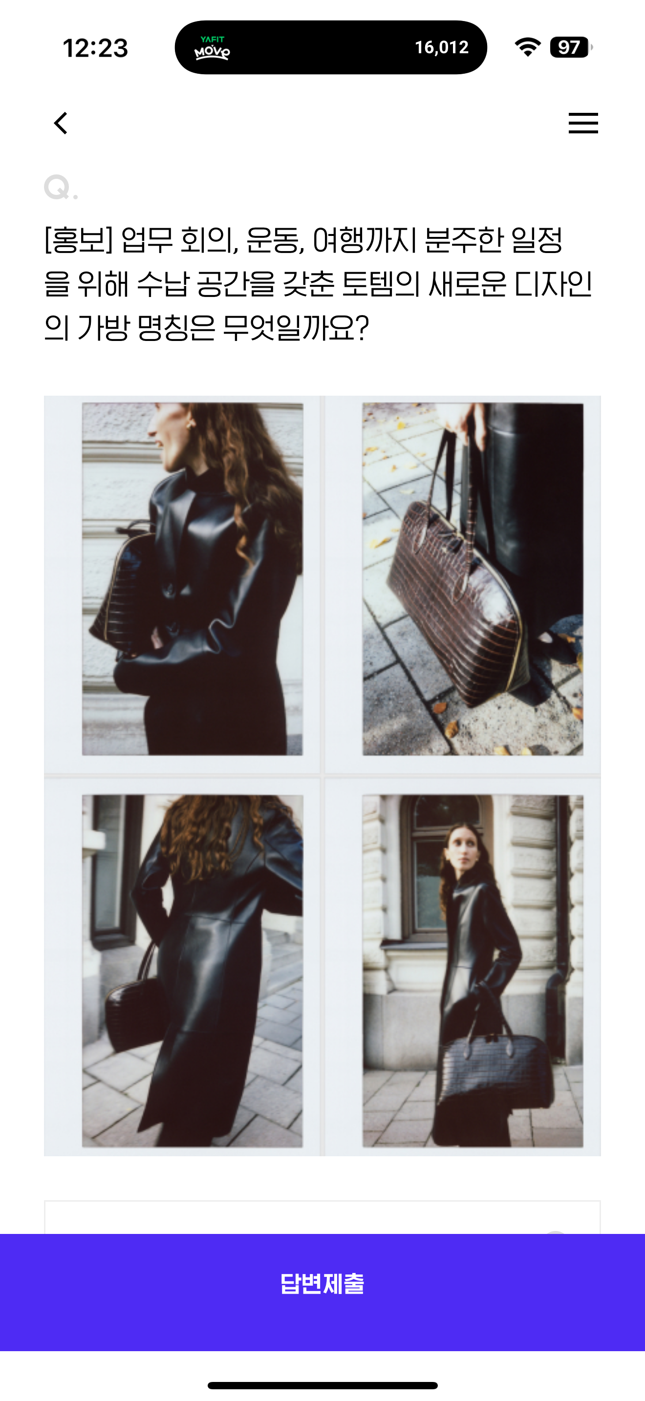 업무 회의, 운동, 여행까지 분주한 일정을 위해 수납 공간을 갖춘 토템의 새로운 디자인의 가방 명칭은 무엇일까요? 보기는 1. 스쿠프트 슬링 백 2. 티-락 백 3. 데이 토트 백 4. 벨티드 버킷 백 입니다. 다용도로 사용할 수 있는 가방이니 잘 참고해 보세요