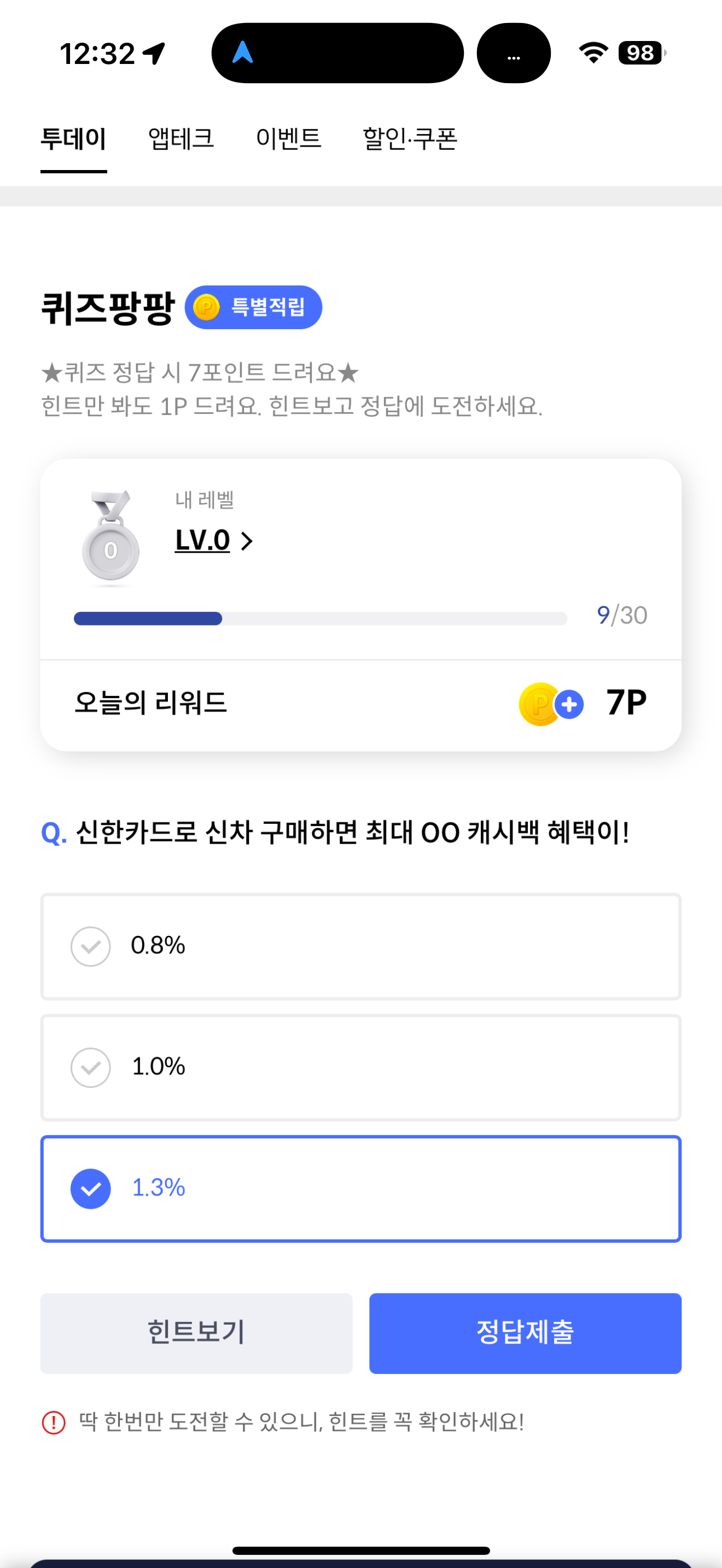신한카드 퀴즈팡팡 정답은 1.3% 입니다