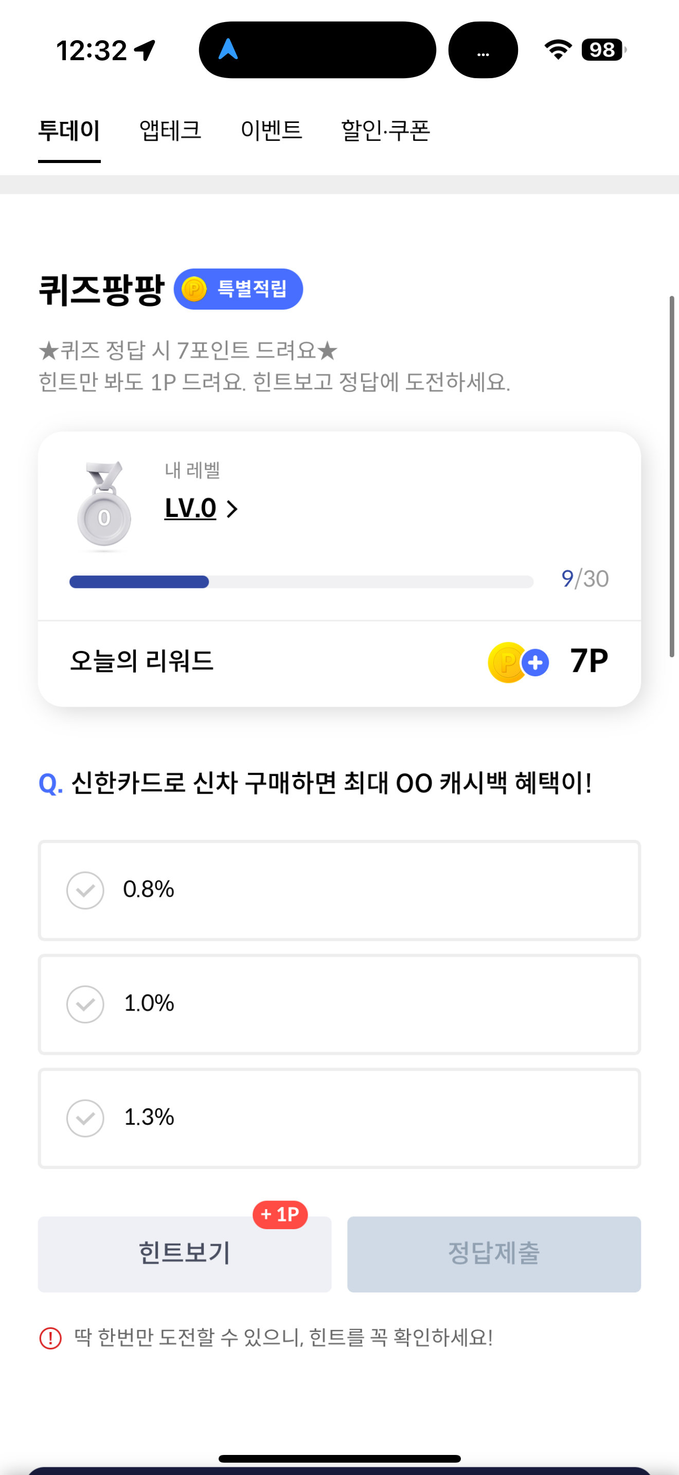 신한카드 퀴즈팡팡 정답은 1.3% 입니다