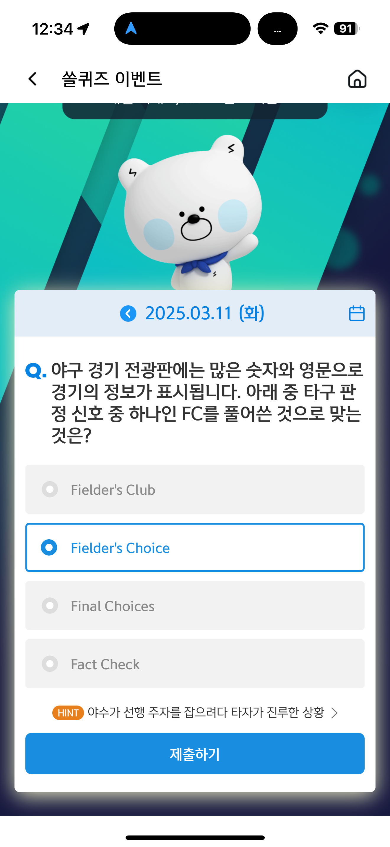 신한 슈퍼SOL 야구/상식 쏠퀴즈 정답은 Fieder's Choice 입니다