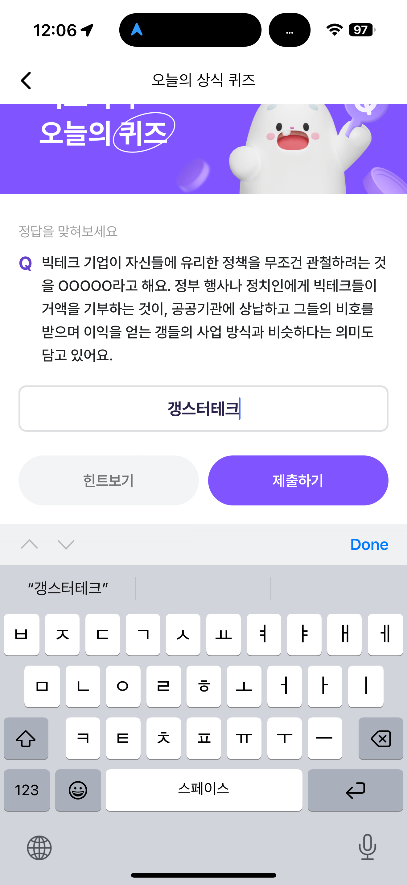 빅테크 기업이 자신들에 유리한 정책을 무조건 관철하려는 것을 OOOOO라고 해요. 정부 행사나 정치인에게 빅테크들이 거액을 기부하는 것이, 공공기관에 상납하고 그들의 비호를 받으며 이익을 얻는 갱들의 사업 방식과 비슷하다는 의미도 담고 있어요. 주관식 퀴즈인데요.