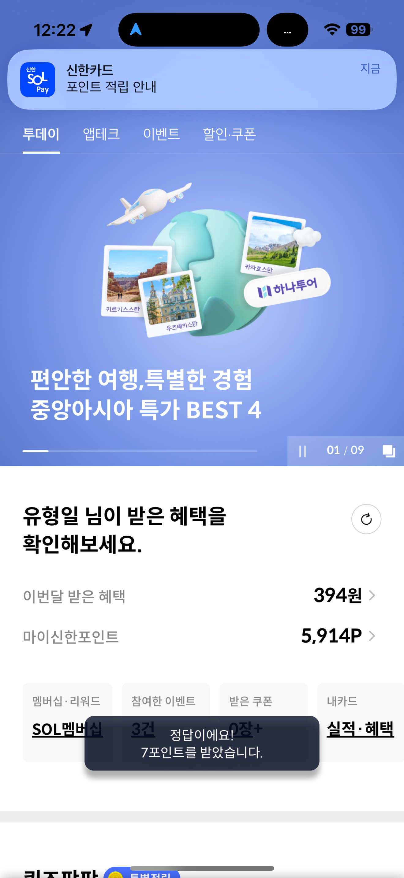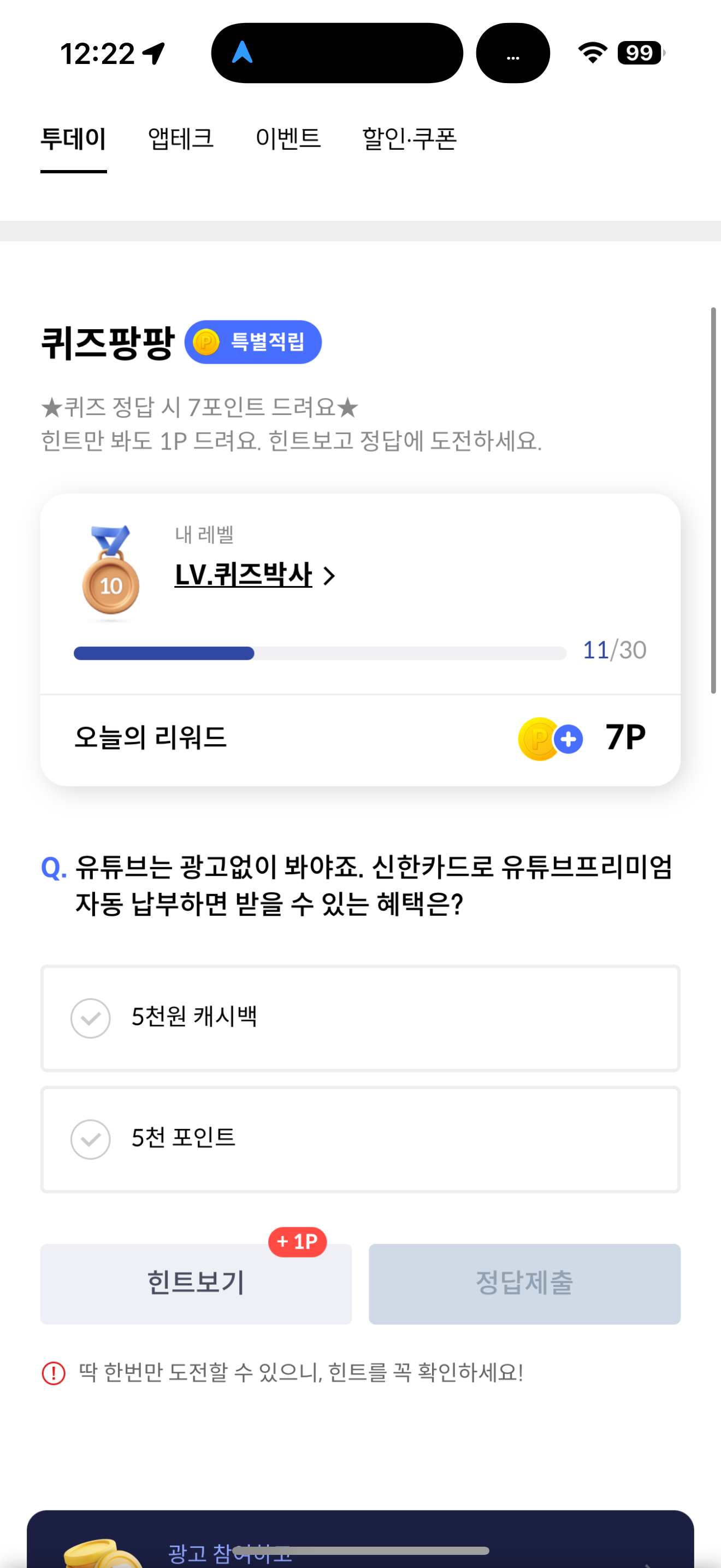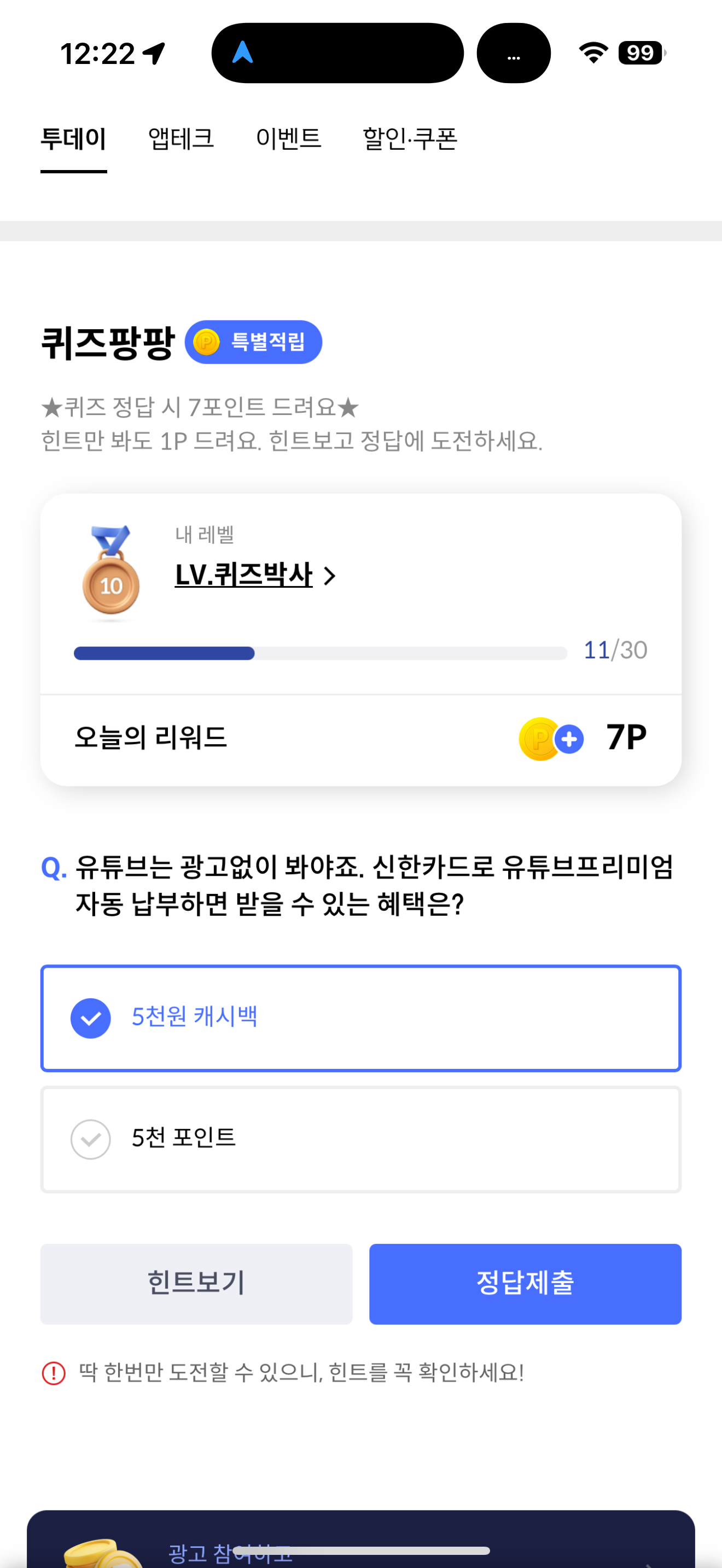신한카드 퀴즈팡팡 정답은 5천원 캐시백 입니다