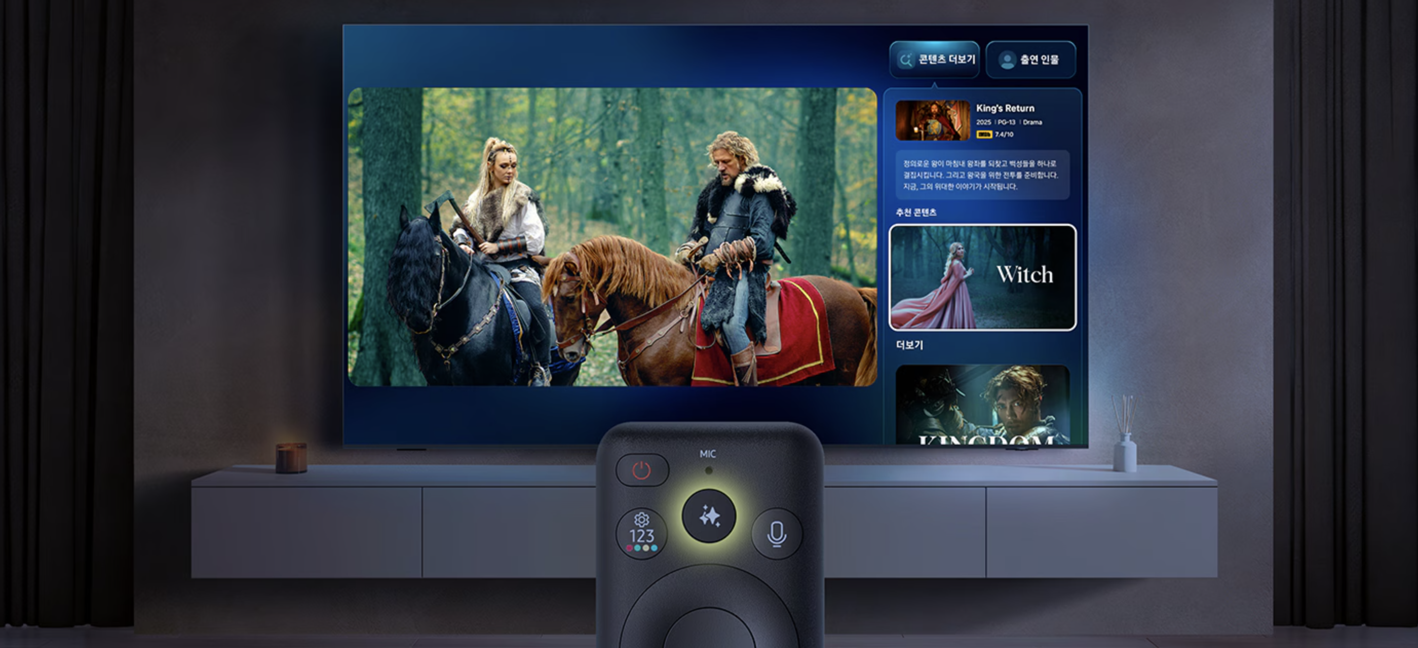 - 클릭 투 서치: 리모컨에 새롭게 추가된 AI 버튼을 통해 시청 중인 콘텐츠와 유사한 프로그램을 추천하거나 등장인물 정보를 바로 확인할 수 있습니다. 또한, 실시간 번역(Live Translate) 기능을 지원해 글로벌 콘텐츠를 원하는 언어로 감상할 수 있습니다.