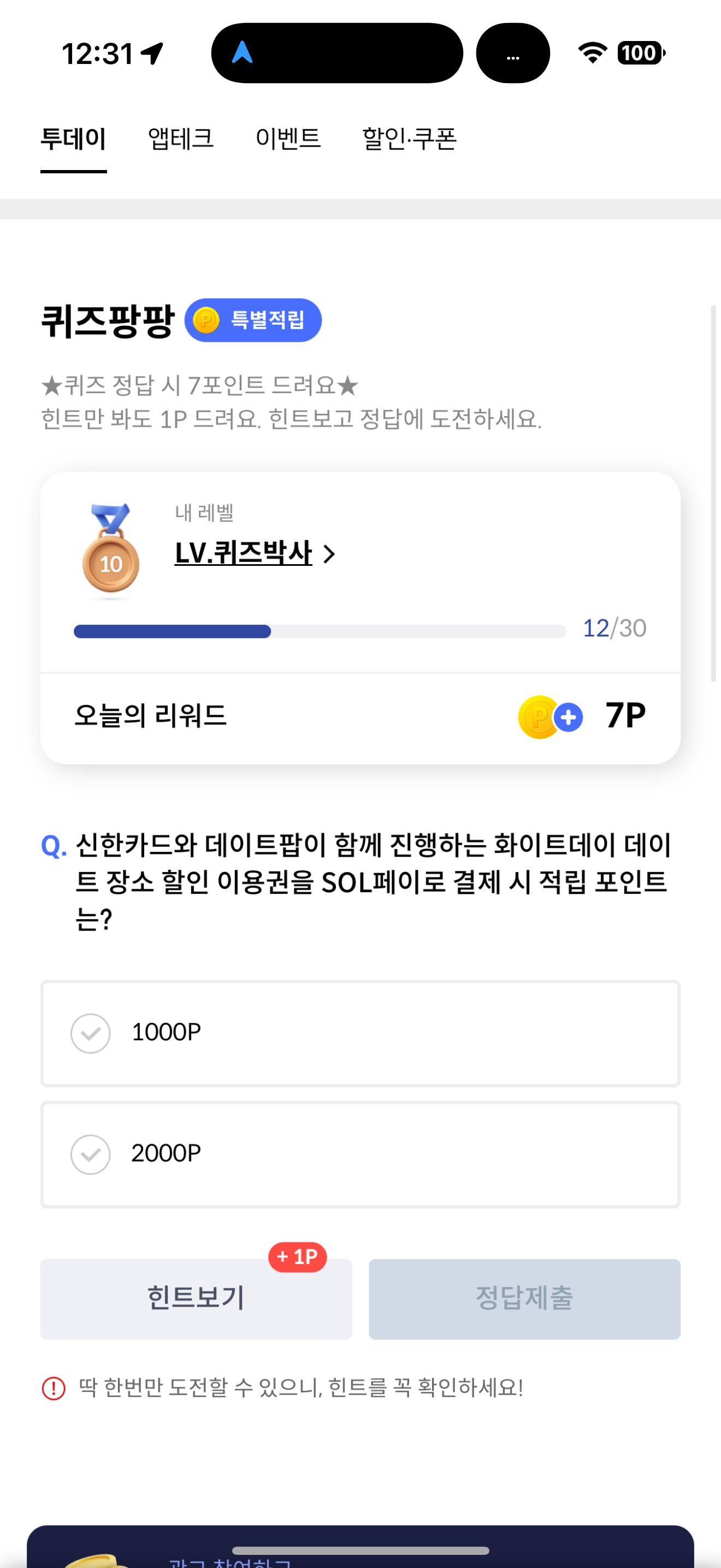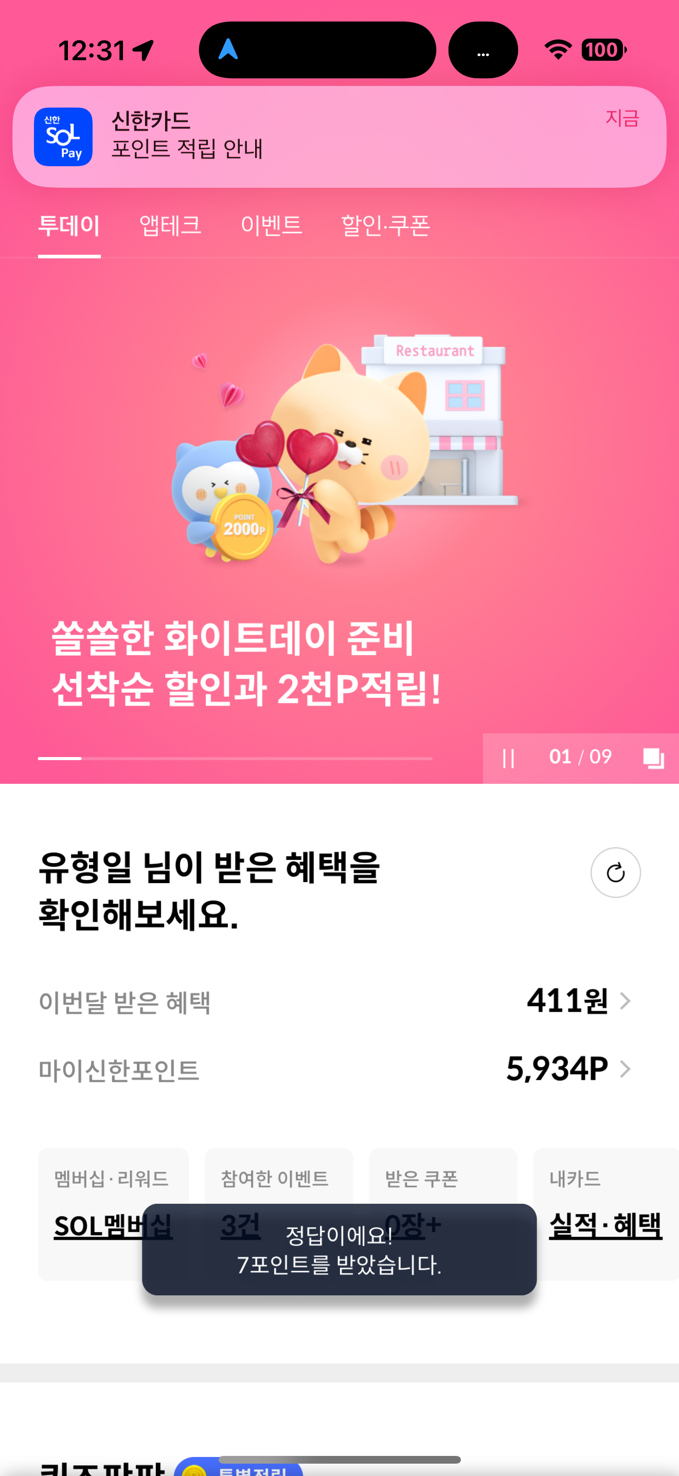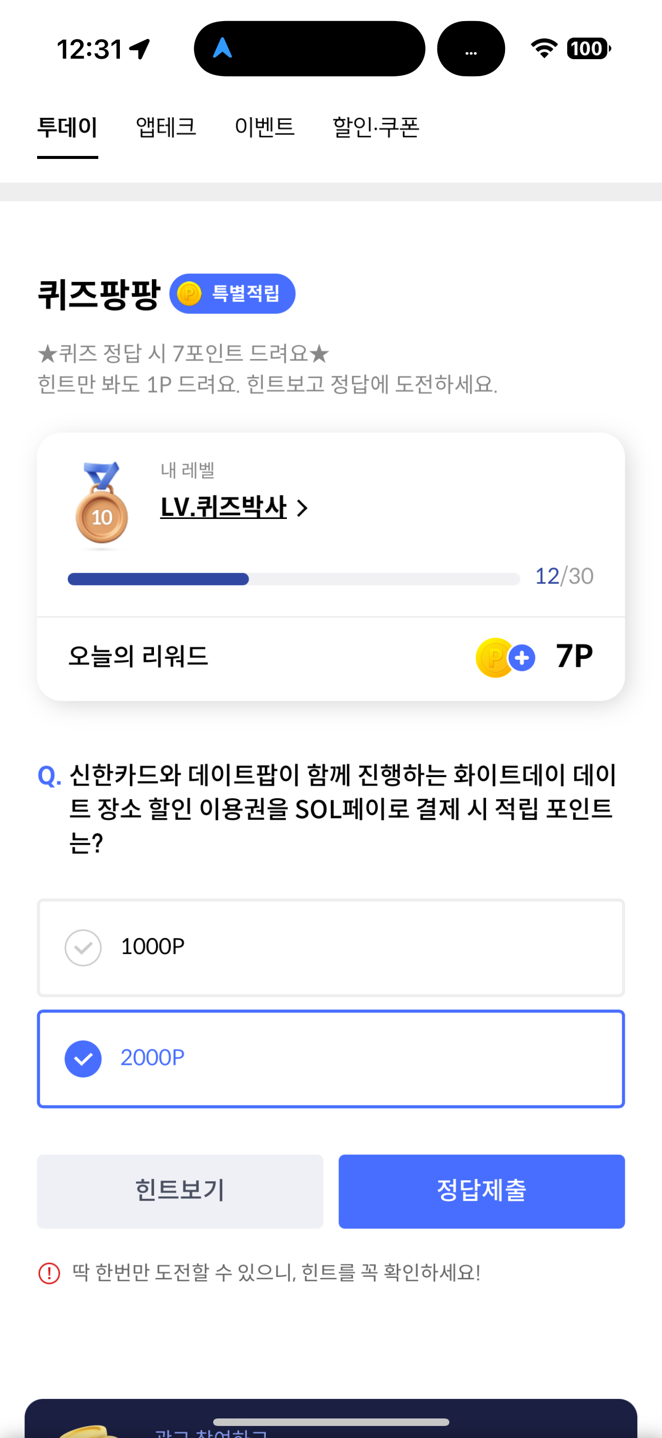 신한카드 퀴즈팡팡 3월 13일 정답(신한카드와 데이트팝이 함께 진행하는 화이트데이 데이트 장소 할인 이용권을 SOL페이로 결제 시 적립 포인트는?)