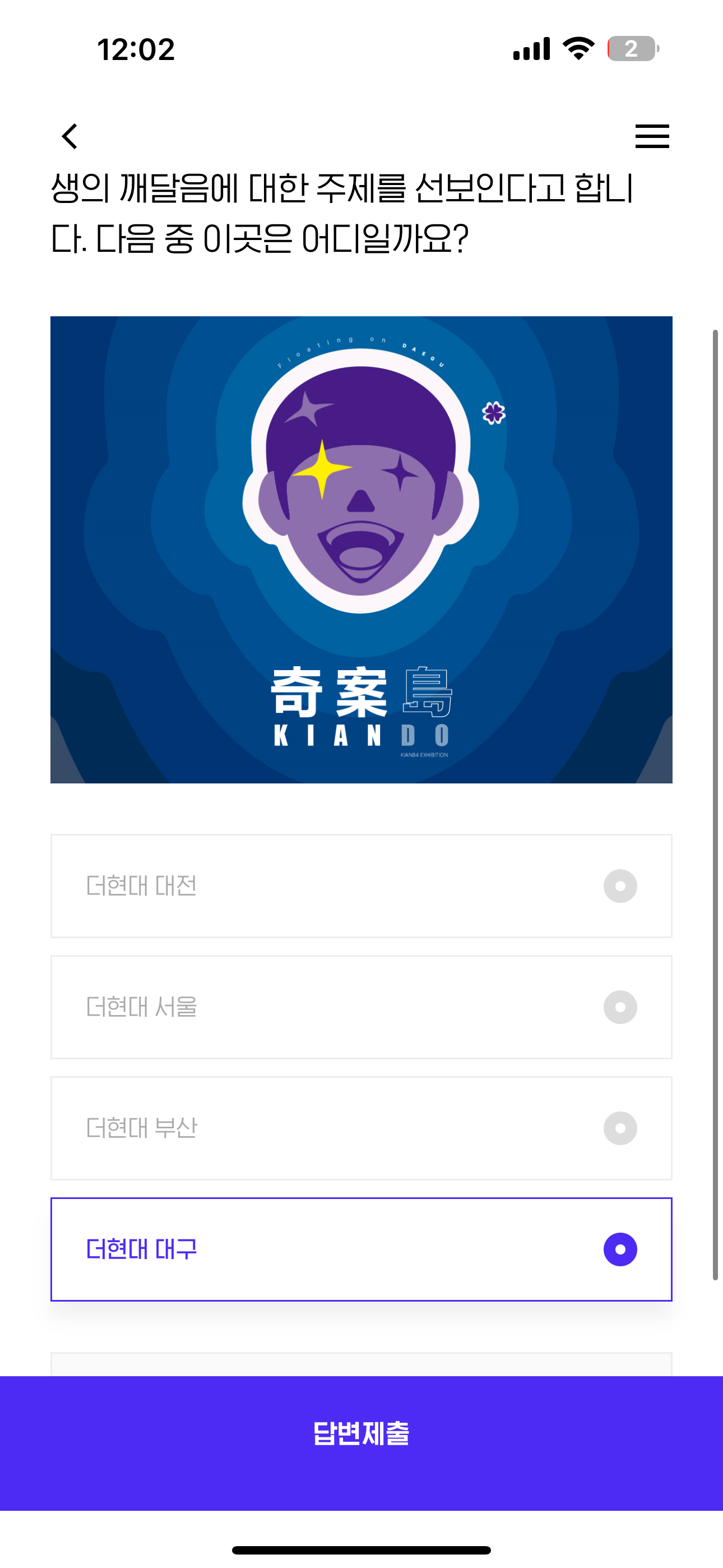 [홍보] 방송인 겸 웹툰 작가 ' 기안84 ' 는 미술 작품 활동과 방송 활동을 병행하며, 특유의 독창적인 아크릴 기반의 작품을 선보이고 있는데요. 이곳에서 7월 5일에 열리는 <기안도>전시에서는 또다시 그리고 새롭게 느낀 인생의 깨달음에 대한 주제를 선보인다고 합니다. 다음 중 이곳은 어디일까요? 보기는 1. 더현대 대전 2. 더현대 서울 3. 더현대 부산 4. 더현대 대구