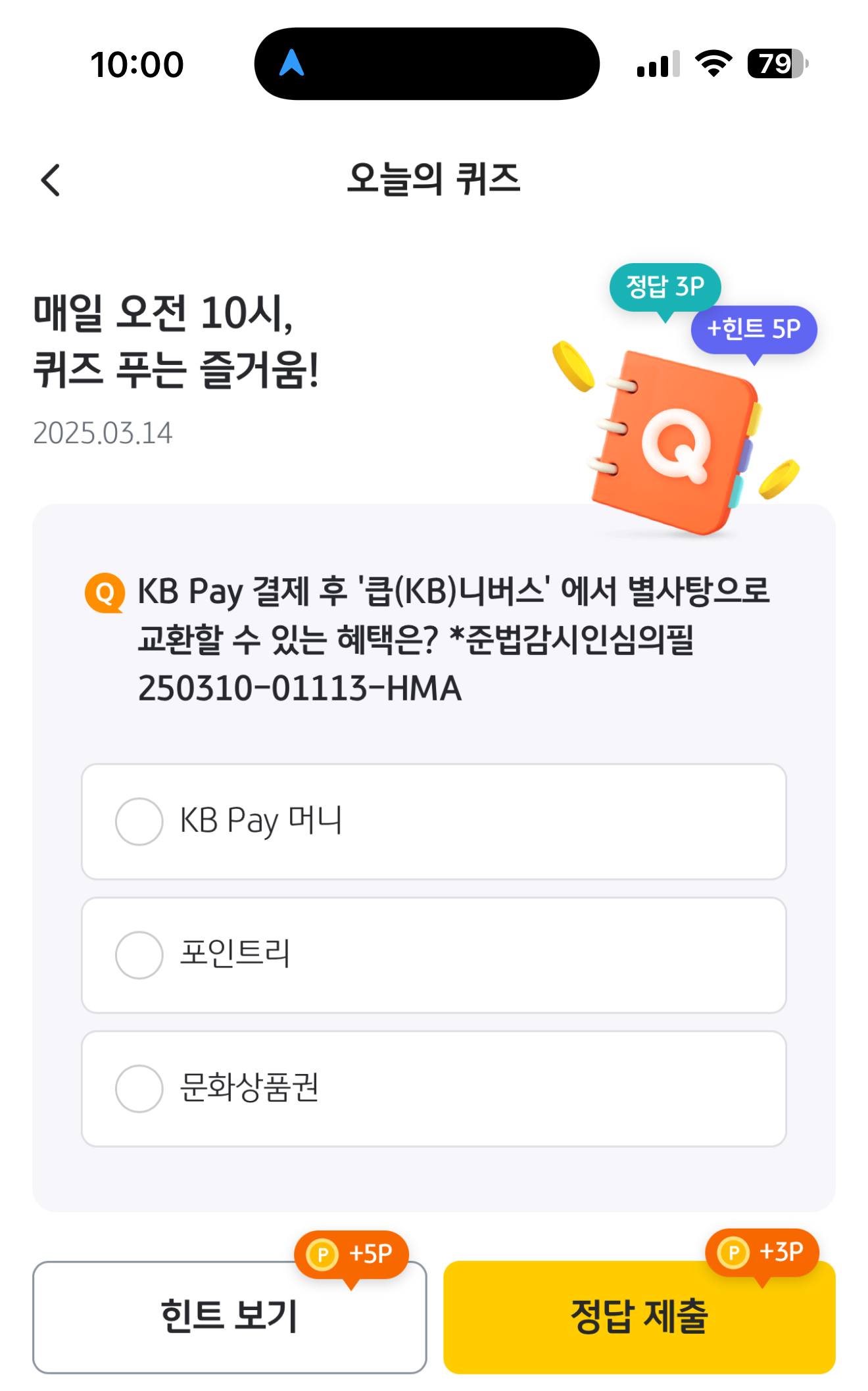KB Pay 오늘의 퀴즈 3월 14일 문제입니다