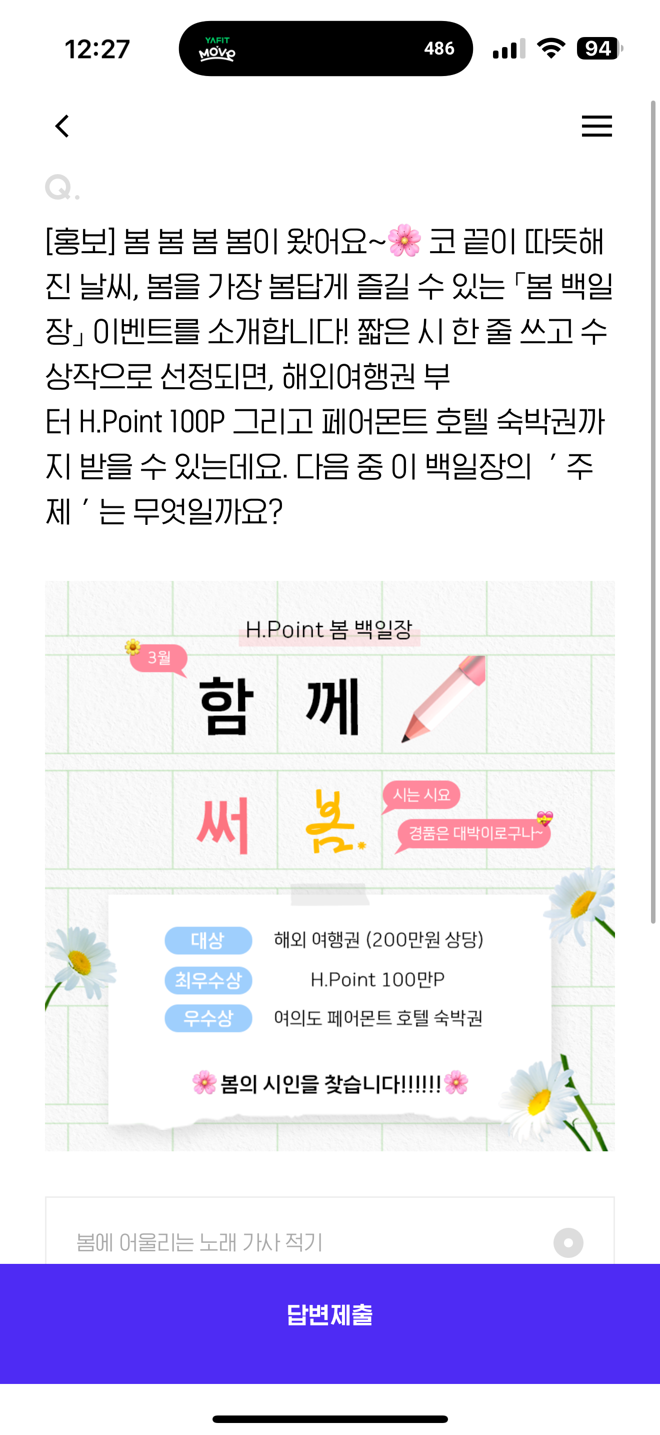 H포인트 퀴즈 3월 15일 정답(봄 봄 봄 봄이 왔어요~ 코 끝이 따뜻해진 날씨, 봄을 가장 봄답게 즐길 수 있는 봄 백일장 이벤트를 소개합니다! 짧은 시 한 줄 쓰고 수상작으로 선정되면, 해외여행권 부터 H.Point 100P 그리고 페어몬트 호텔 숙박권까지 받을 수 있는데요. )
