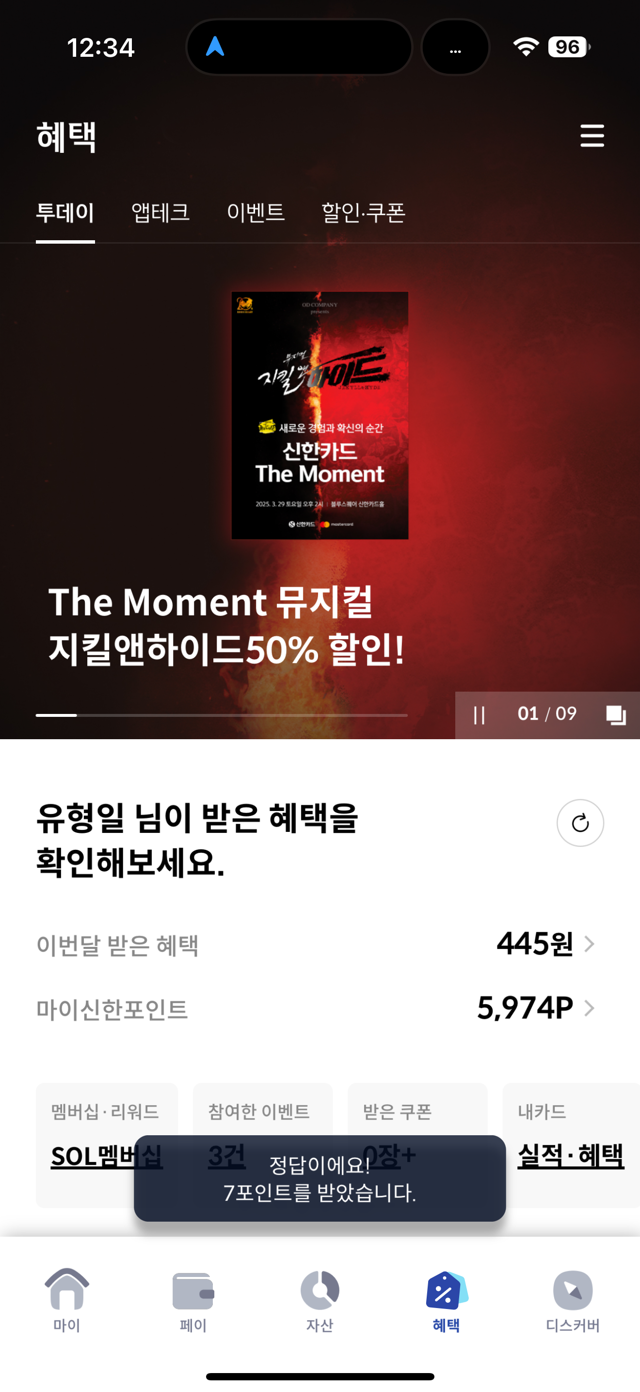 신한카드 퀴즈팡팡 정답은 10만 포인트 입니다