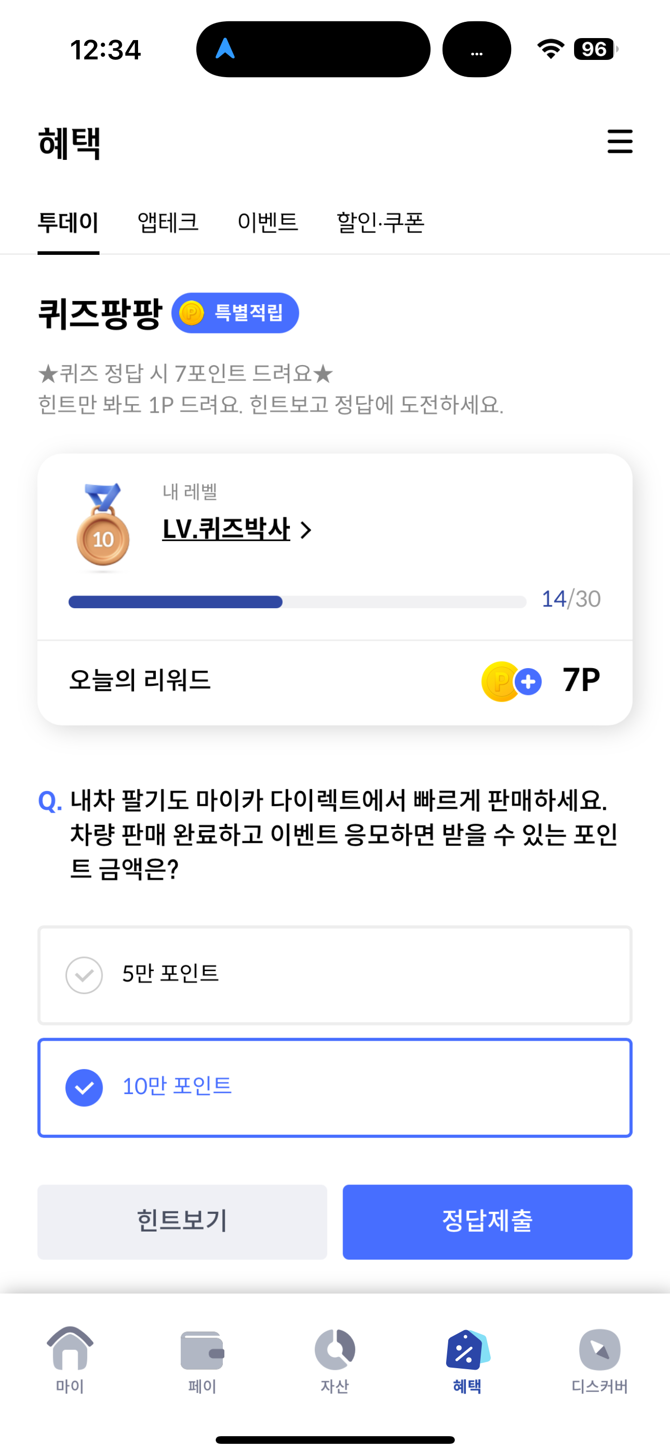 신한카드 퀴즈팡팡 정답은 10만 포인트 입니다