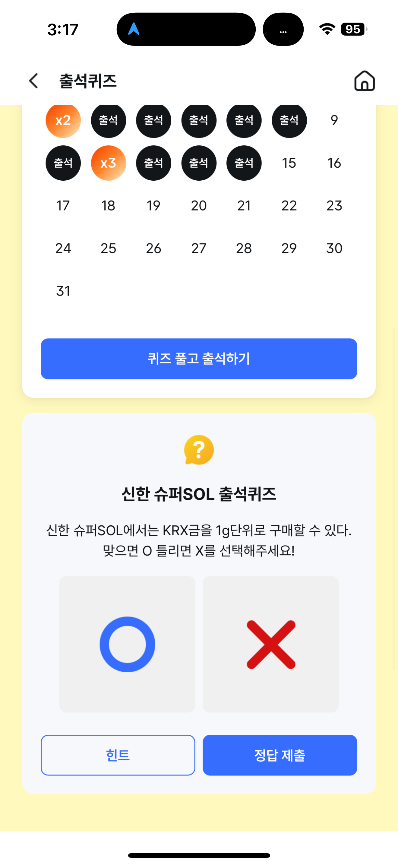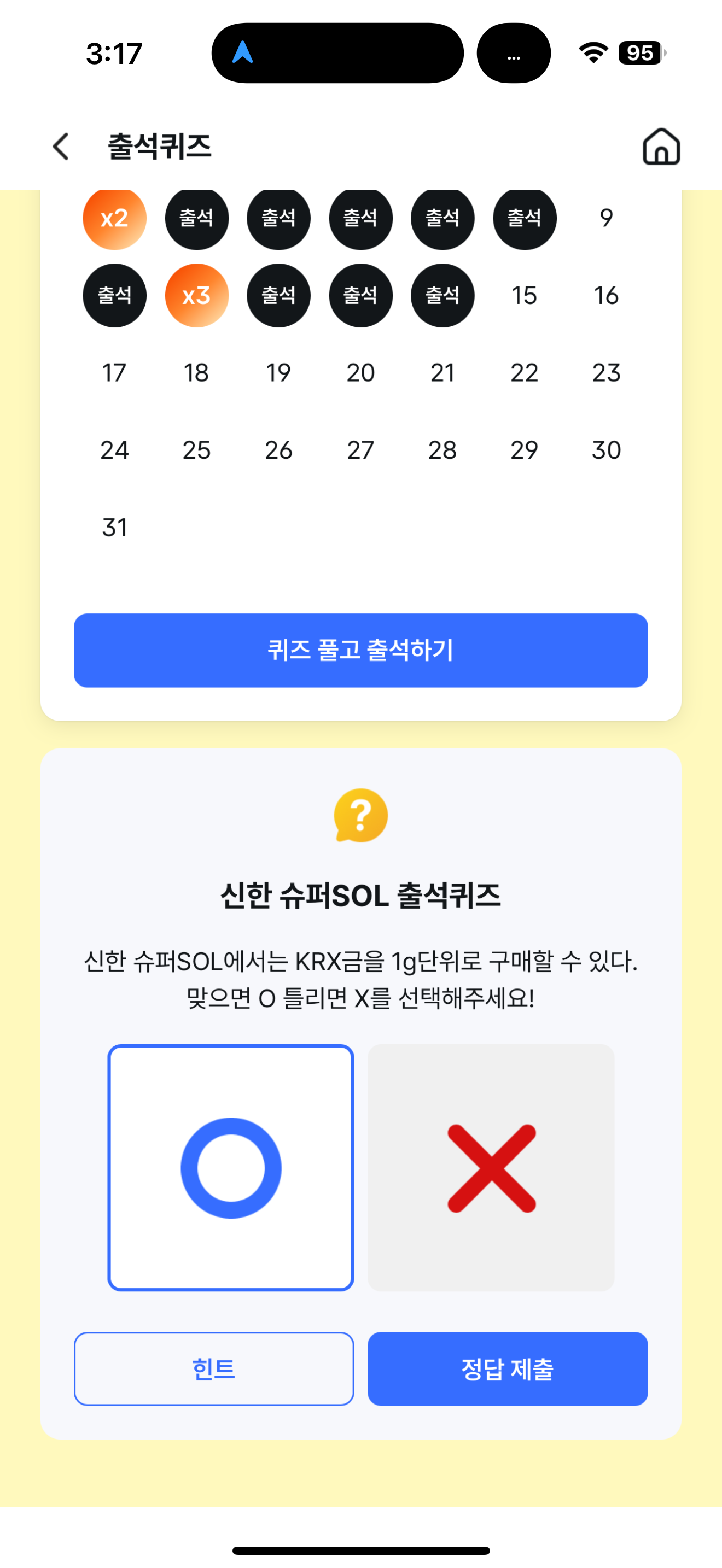 신한 슈퍼SOL 출석퀴즈 정답은 O 입니다