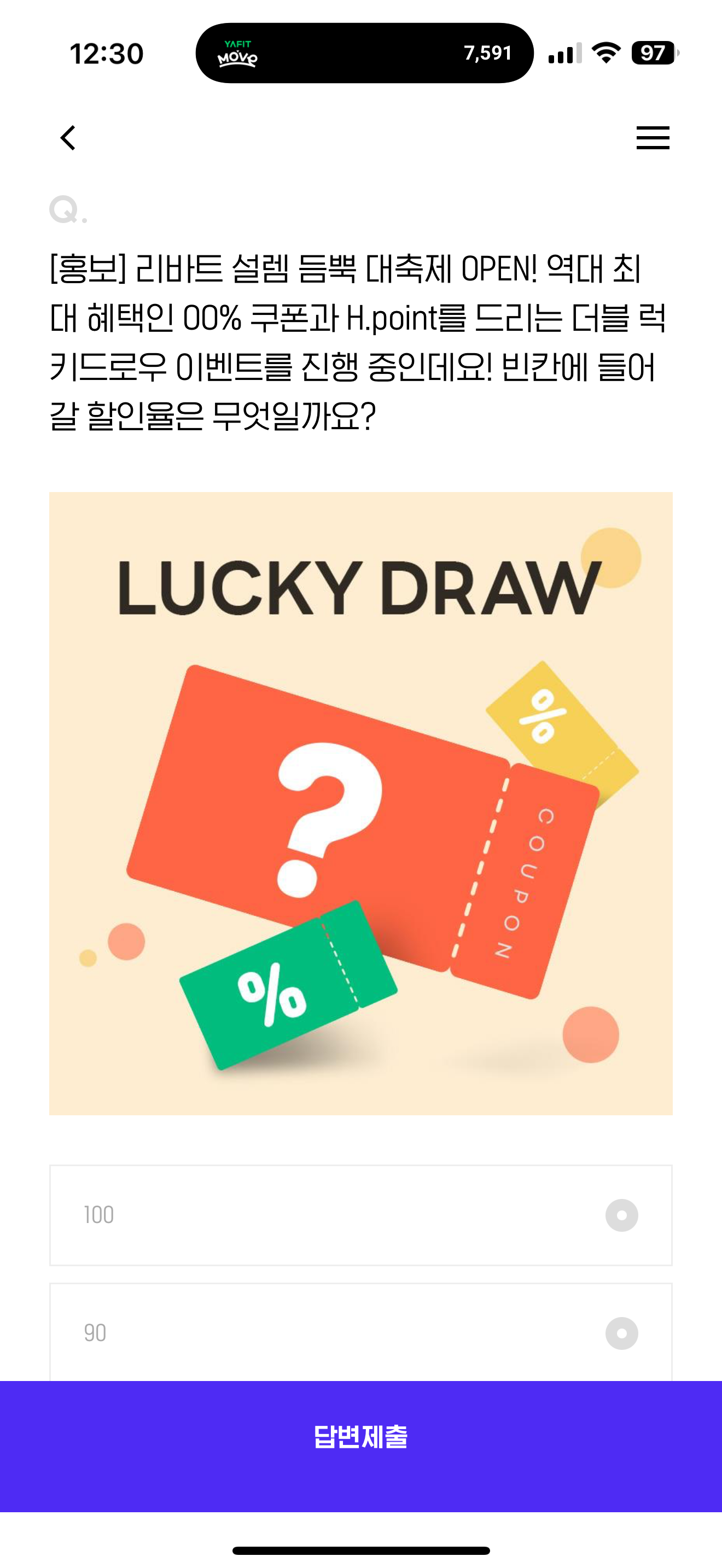 리바트 설렘 듬뿍 대축제 OPEN! 역대 최대 혜택인 00% 쿠폰과 H.point를 드리는 더블 럭키드로우 이벤트를 진행 중인데요! 빈칸에 들어갈 할인율은 무엇일까요? 보기는 1. 100 2. 90 3. 70 4. 50 입니다. 정말 파격적인 할인 혜택을 받을 수 있는 이벤트이니 잘 참고해 보세요