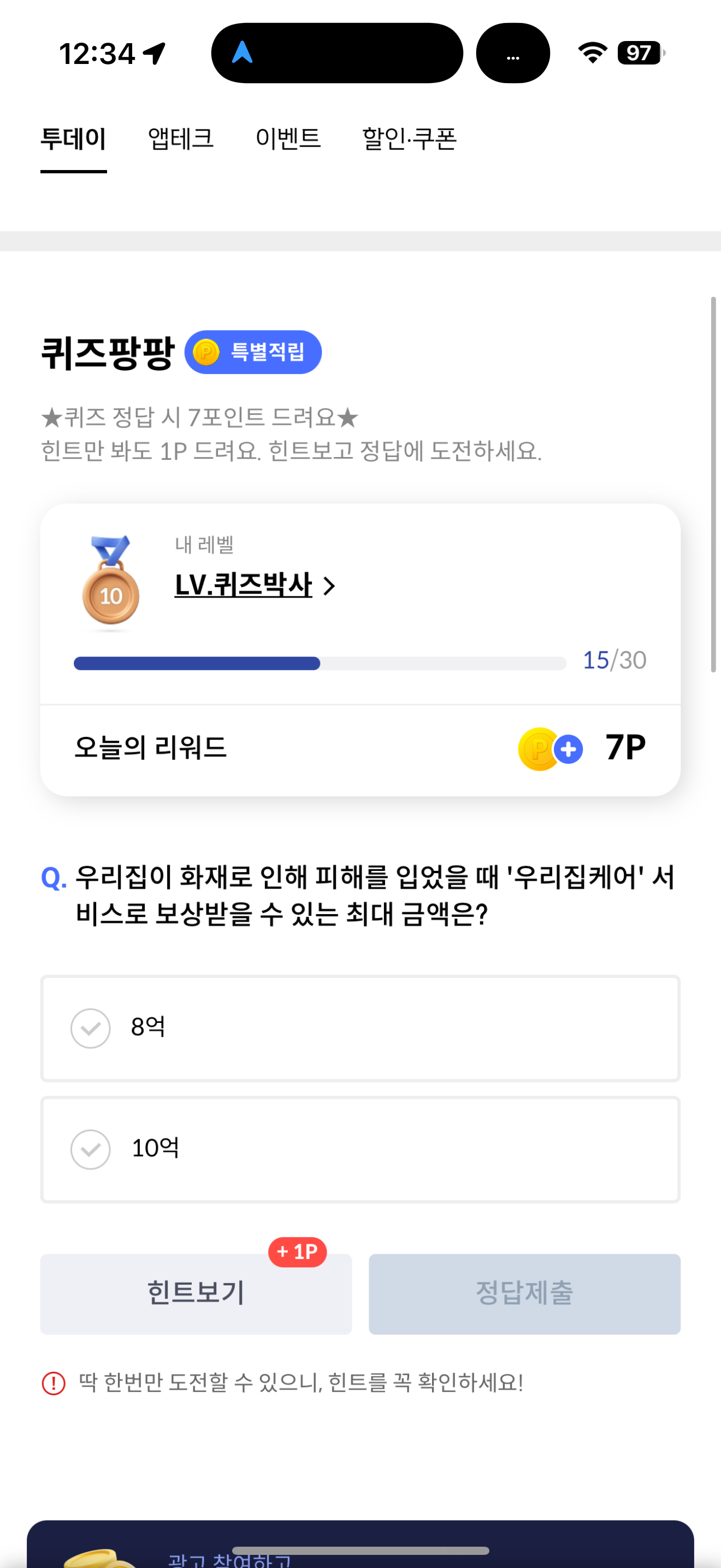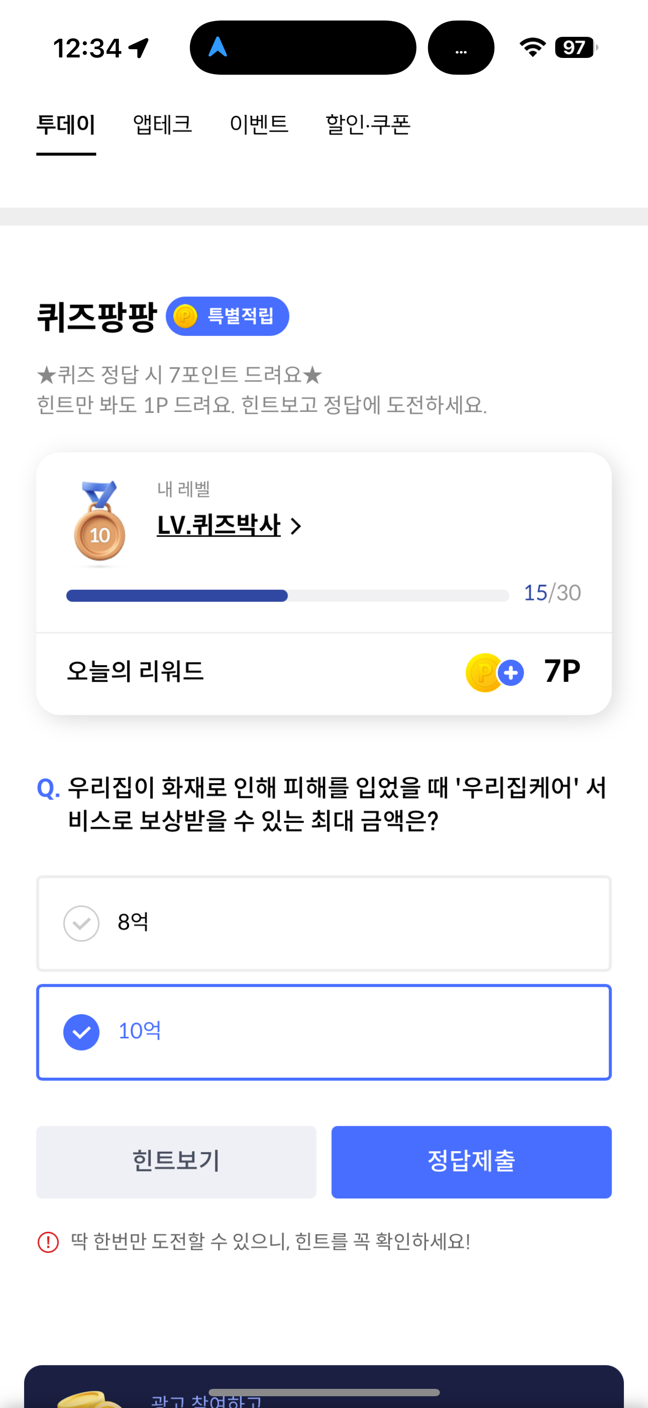 신한카드 퀴즈팡팡 정답은 10억 입니다