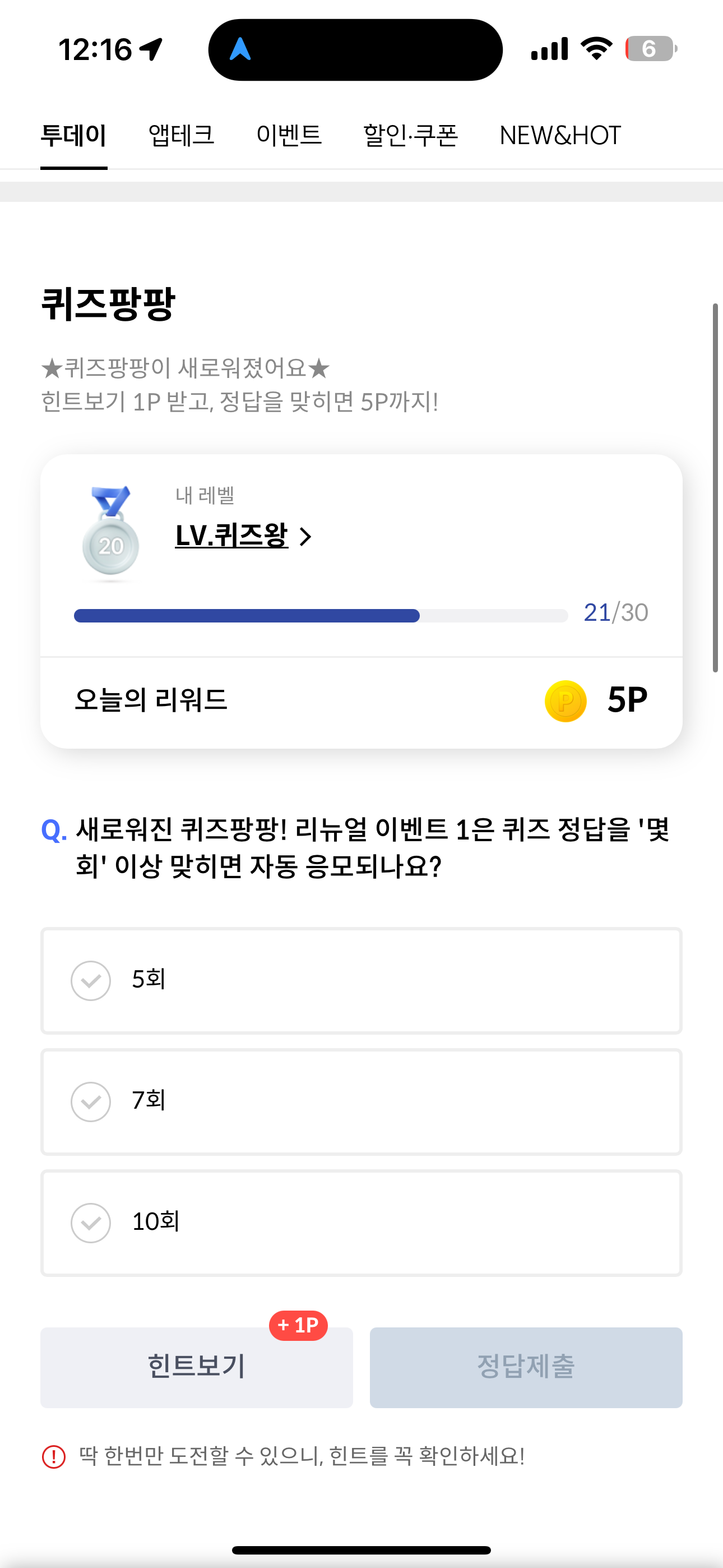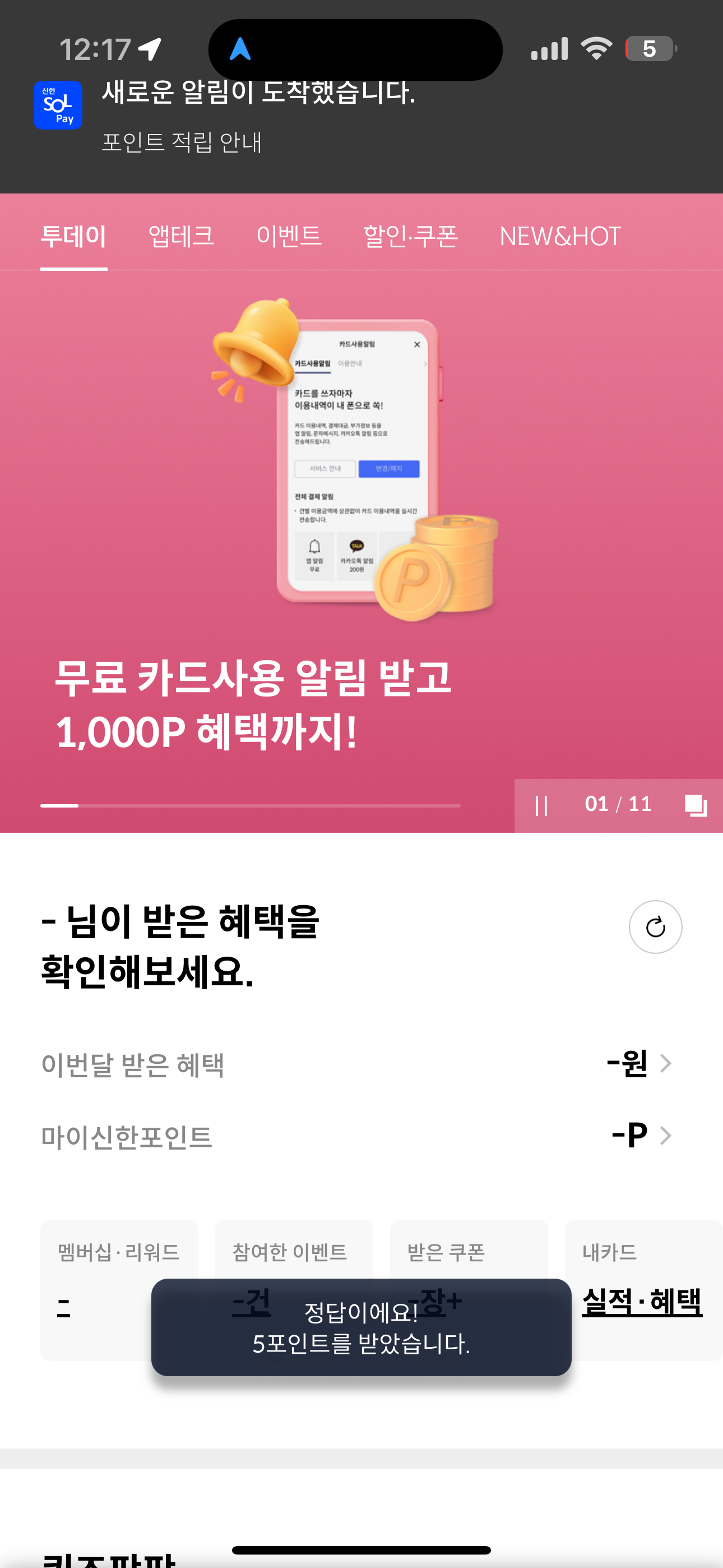 신한카드 퀴즈팡팡 정답은 5회 입니다