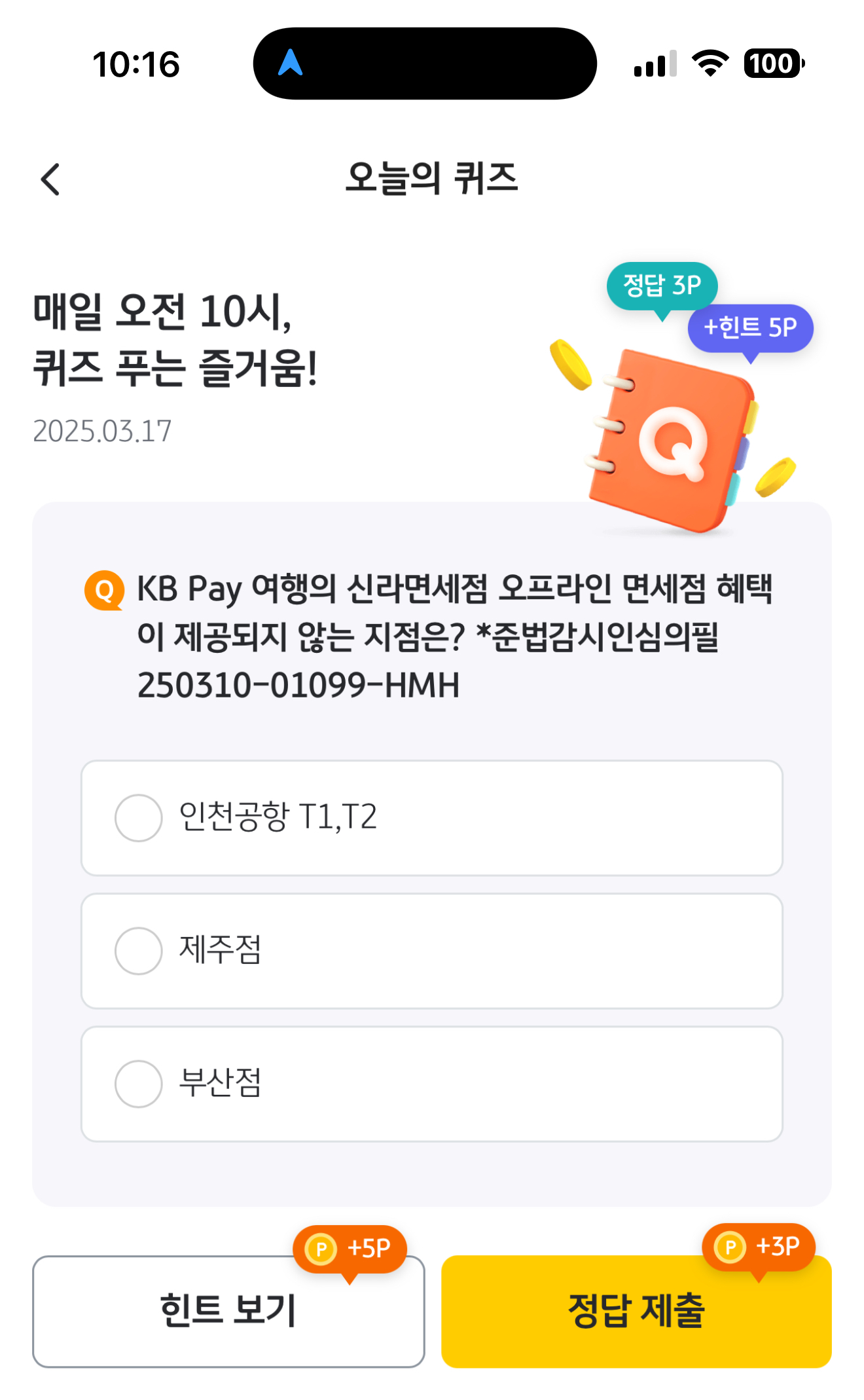 KB Pay 여행의 신라면세점 오프라인 면세점 혜택이 제공되지 않는 지점은? *준법감시인심의필250310-01099-HMH 보기는 1. 인천공항 T1, T2 2. 제주점 3. 부산점 입니다. 여행시 면세점 혜택을 볼 수 있는 정보이니 잘 참고해서 활용해 보세요