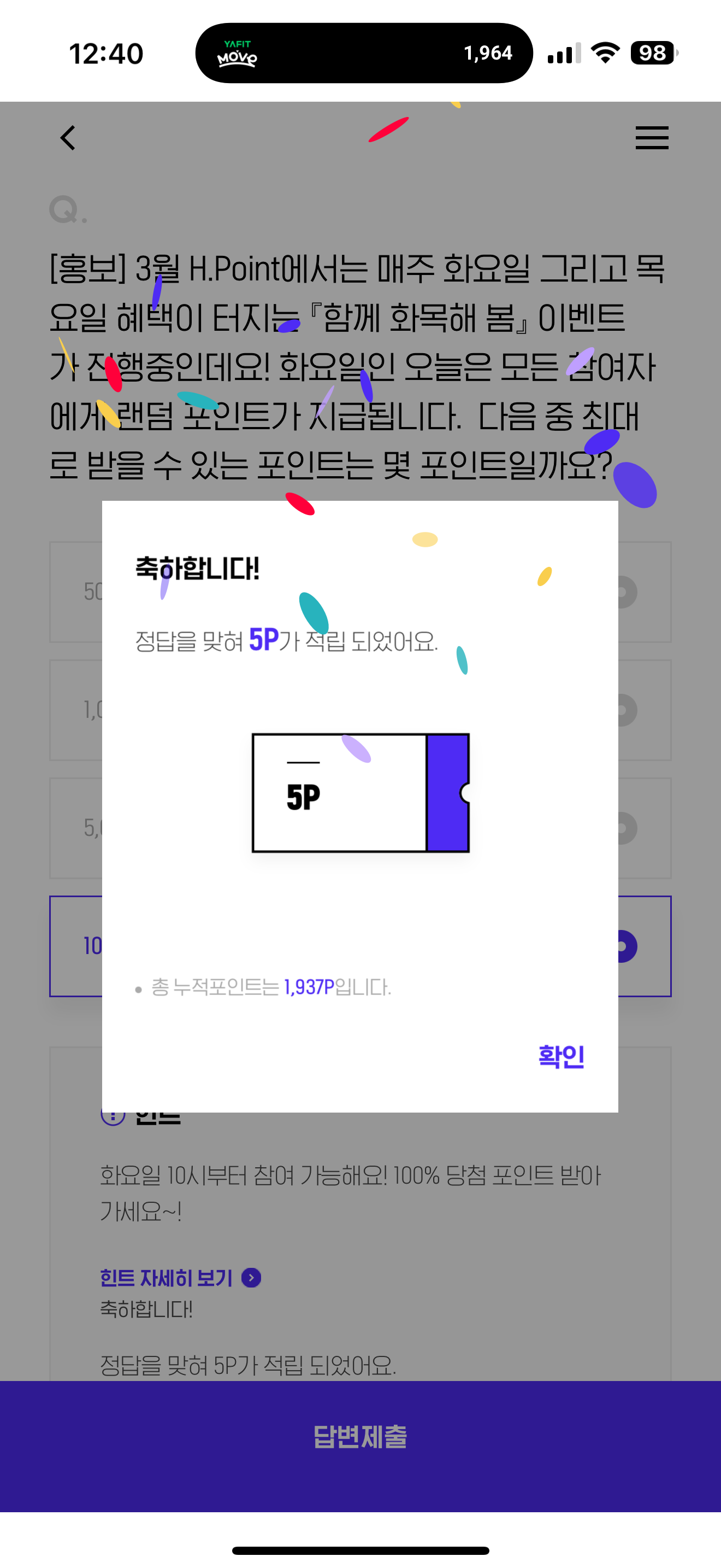 3월 H.Point에서는 매주 화요일 그리고 목요일 혜택이 터지는 함께 화목해 봄 이벤트가 진행중인데요! 화요일인 오늘은 모든 참여자에게 랜덤 포인트가 지급됩니다. 다음 중 최대로 받을 수 있는 포인트는 몇 포인트일까요? 보기는 1. 500P 2. 1,000P 3. 5,000P 4. 10,000P 입니다