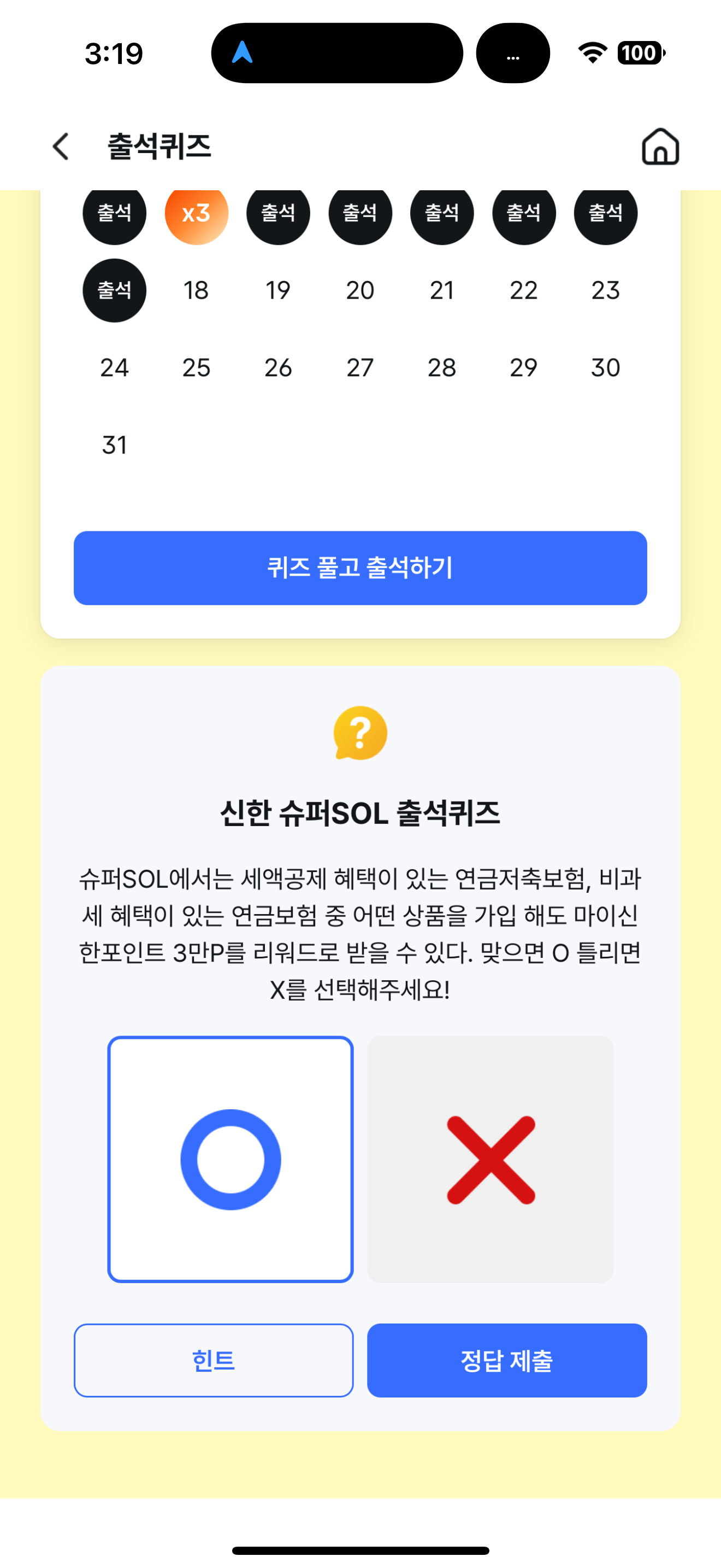 신한 슈퍼SOL 출석퀴즈 정답은 O 입니다