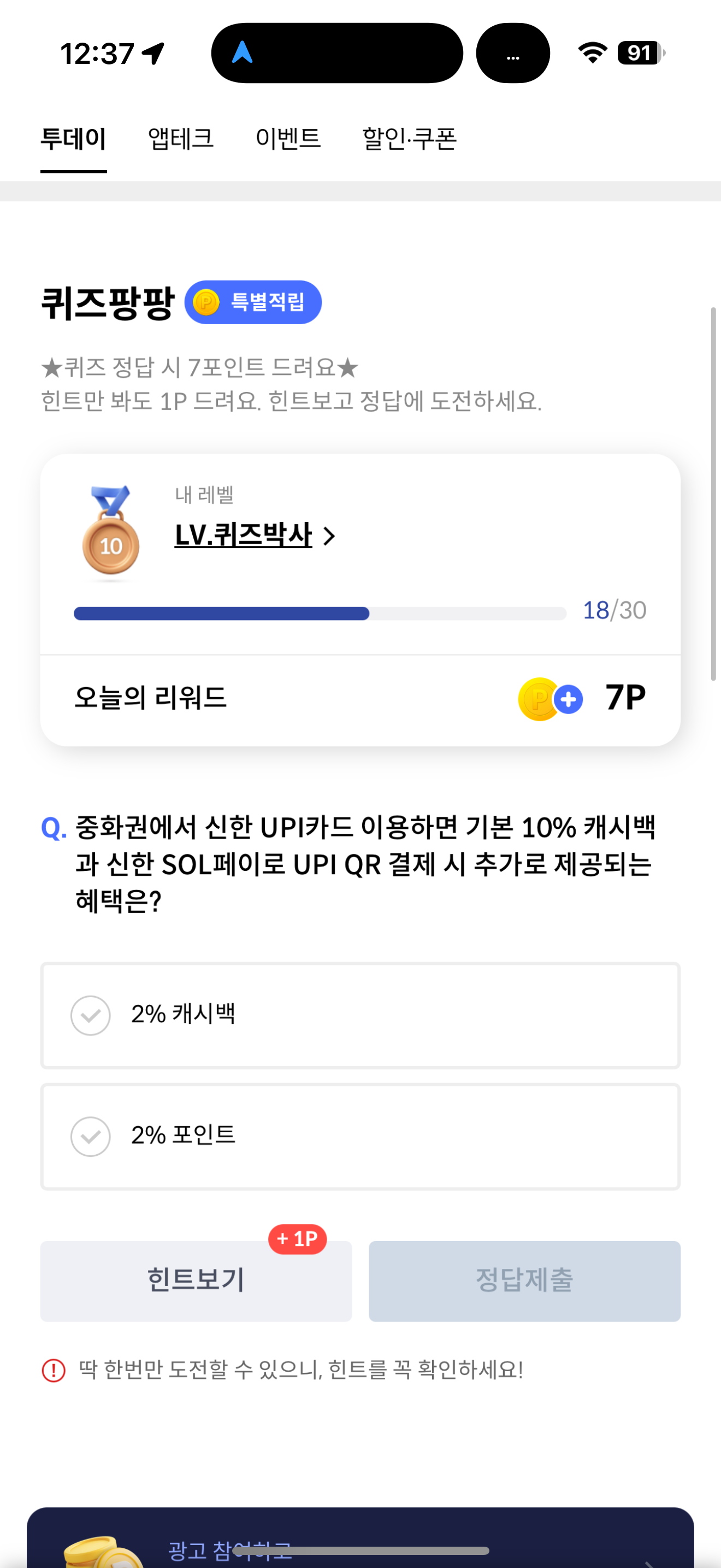 신한카드 퀴즈팡팡 정답은 2% 캐시백 입니다