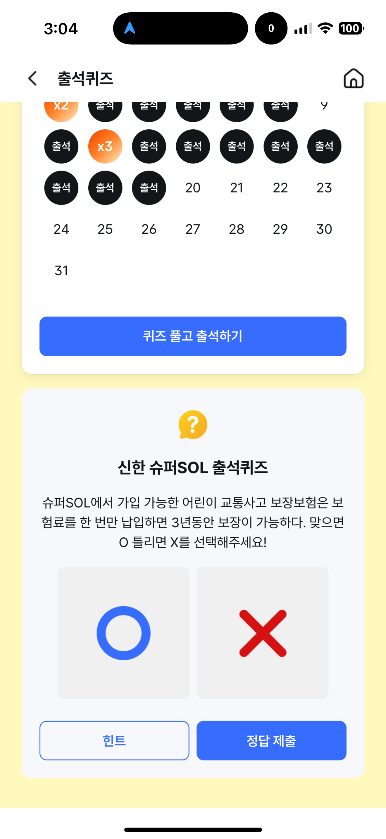 신한 슈퍼SOL 출석퀴즈 정답은 O 입니다