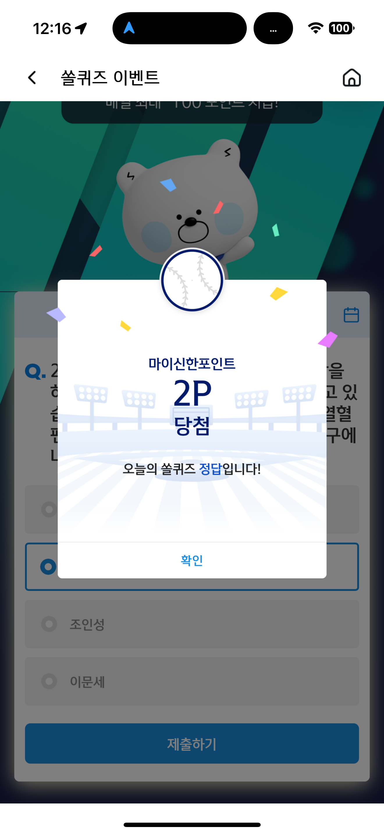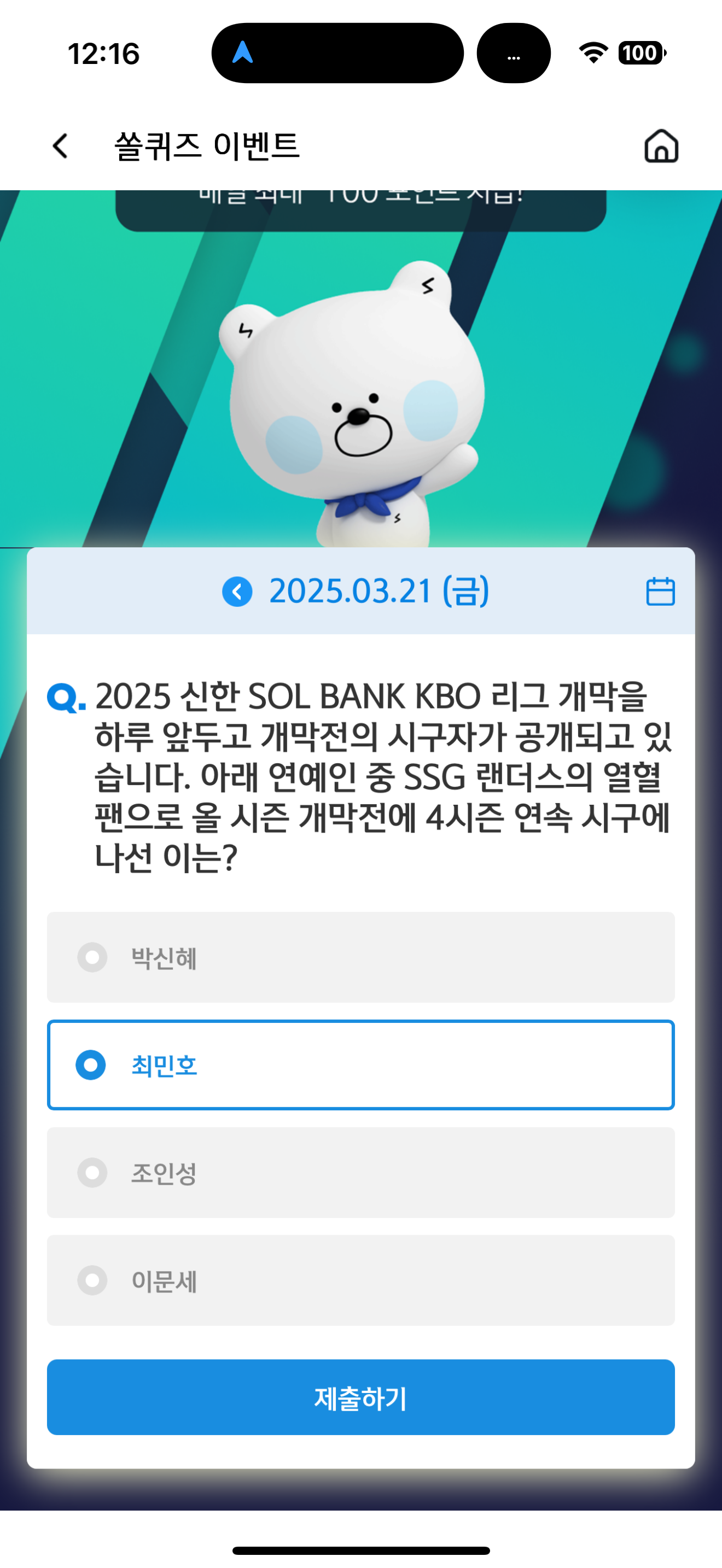 신한 슈퍼SOL 야구/상식 쏠퀴즈 정답은 최민호 입니다