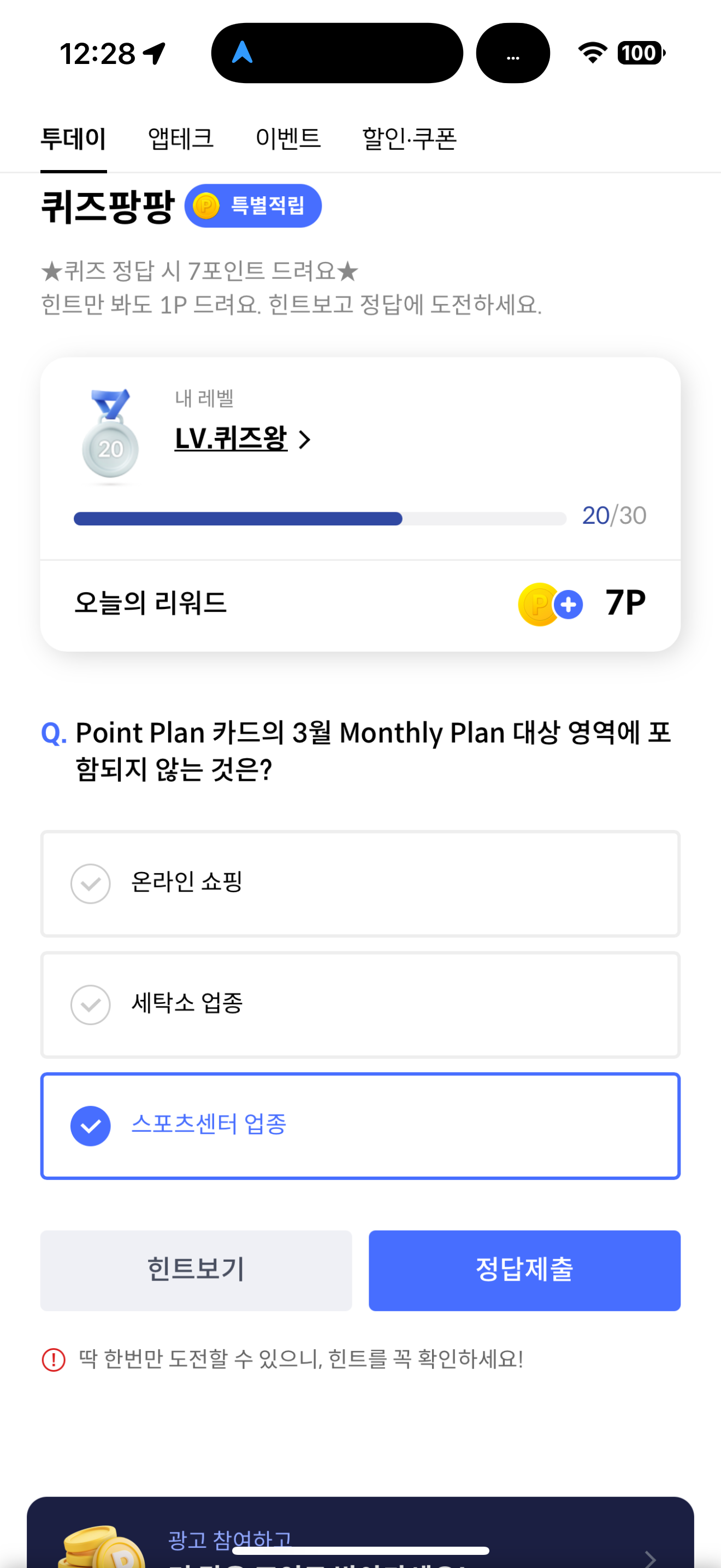 신한카드 퀴즈팡팡 정답은 스포츠센터 업종 입니다