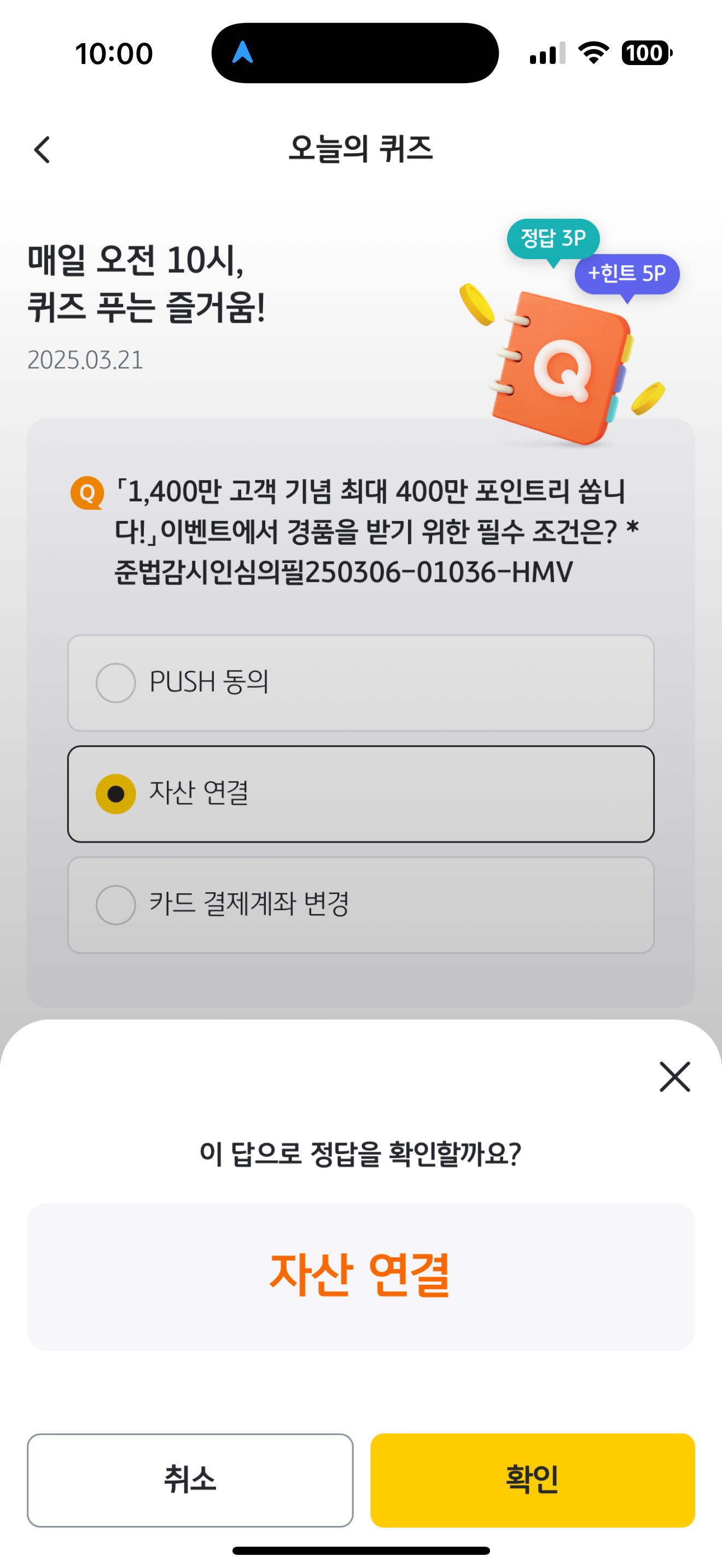 1,400만 고객 기념 최대 400만 포인트리 쏩니다! 이벤트에서 경품을 받기 위한 필수 조건은? *준법감시인심의필250306-01036-HMV 보기는 1. PUSH 동의 2. 자산 연결 3. 카드 결제계좌 변경 입니다. 400만 포인트리를 주는 이벤트이니 잘 참고해서 도전해 보세요