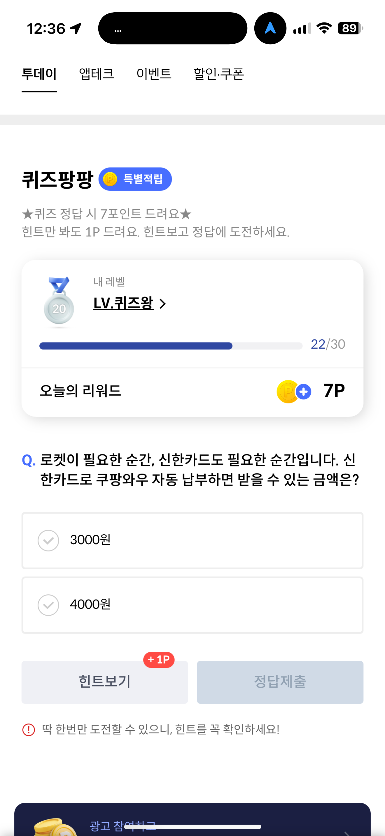 신한카드 퀴즈팡팡 정답은 4000원 입니다