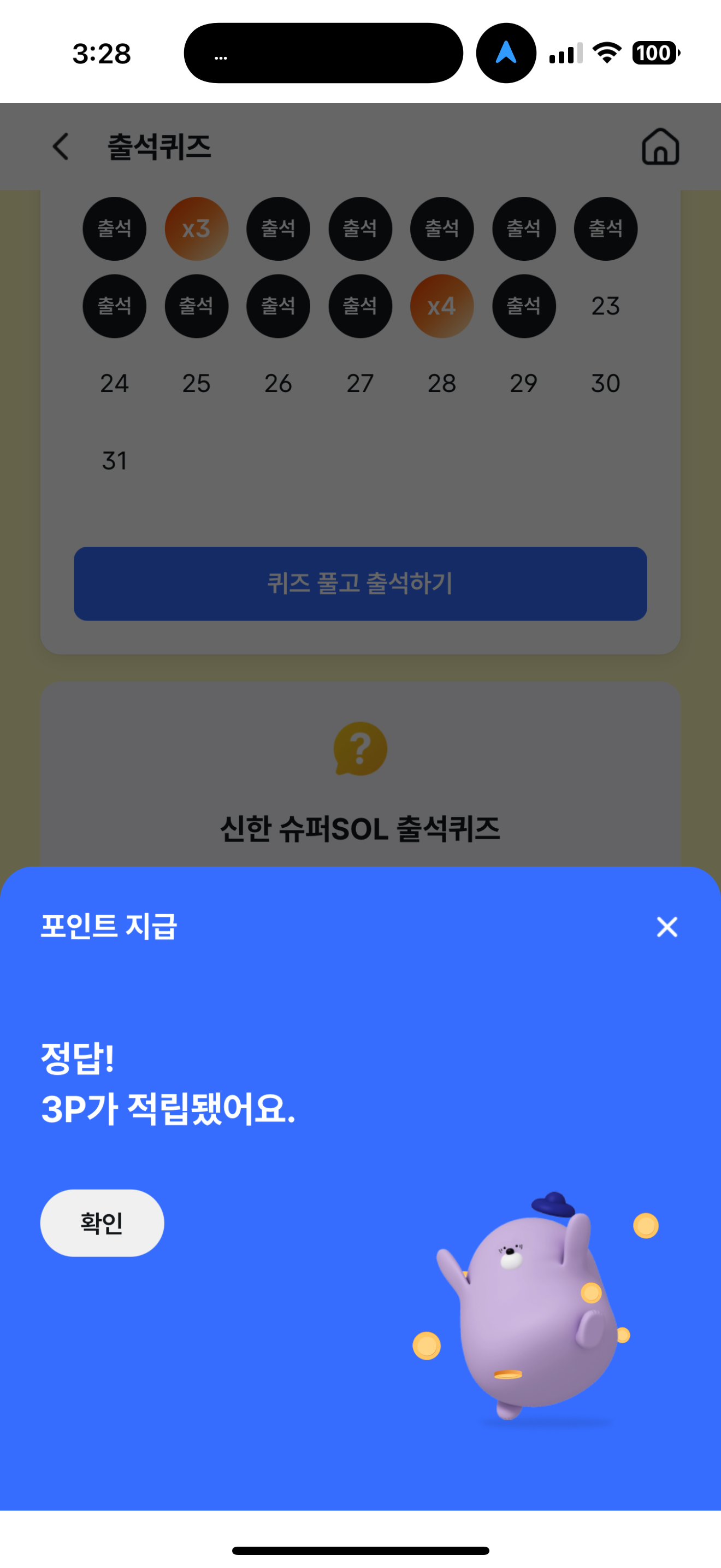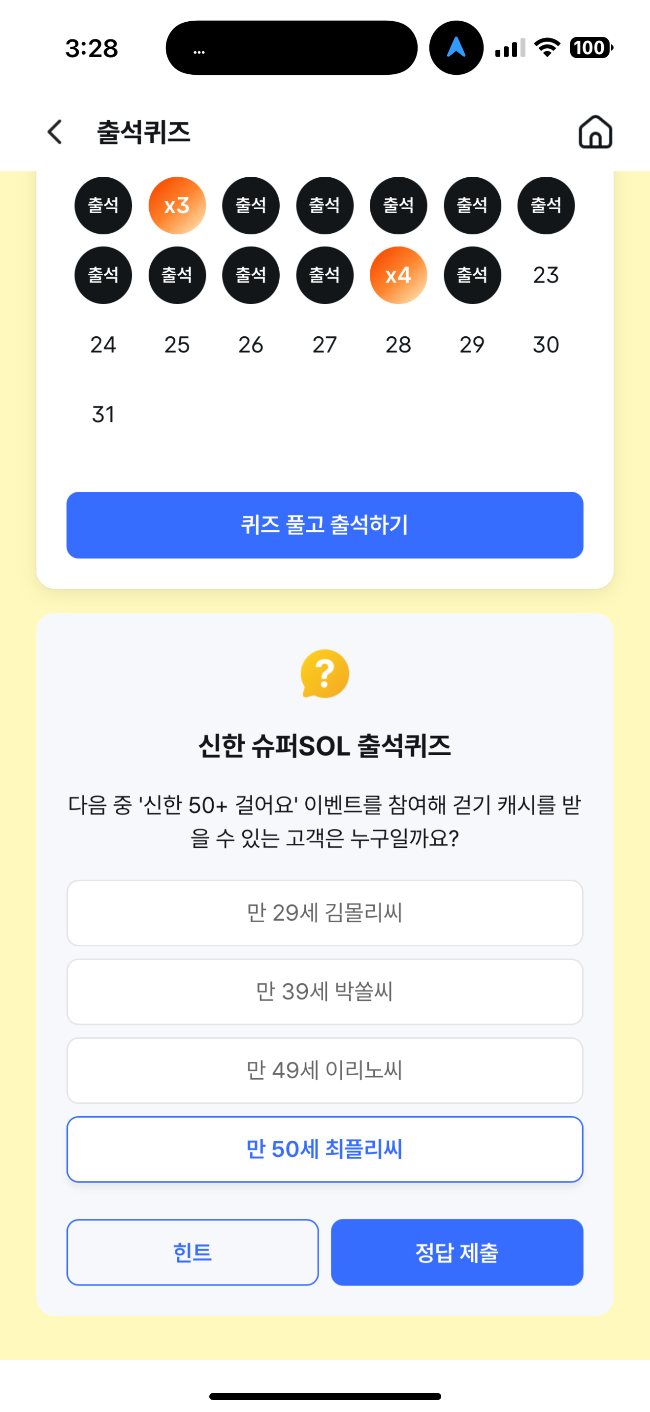 신한 슈퍼SOL 출석퀴즈 정답은 만 50세 최플리씨 입니다
