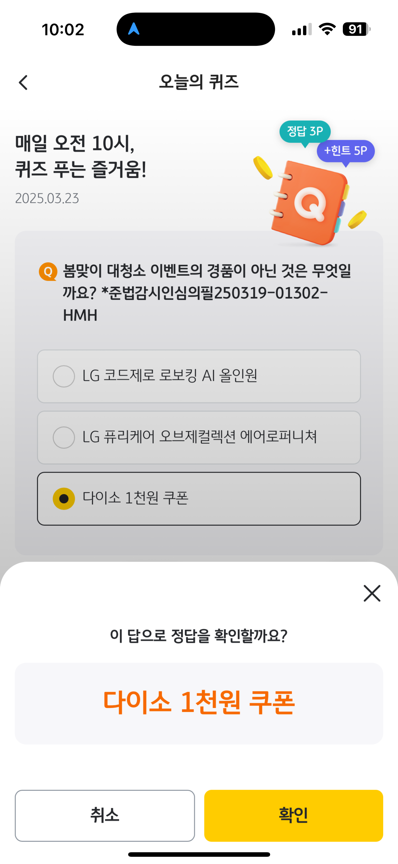 봄맞이 대청소 이벤트의 경품이 아닌 것은 무엇일까요? *준법감시인심의필250319-01302-HMH 보기는 1. LG 코드제로 로보킹 AI 올인원 2. LG 퓨리케어 오브제컬렉션 에어로퍼니처 3. 다이소 1천원 쿠폰 입니다. 봄맞이 대청소 해보세요.