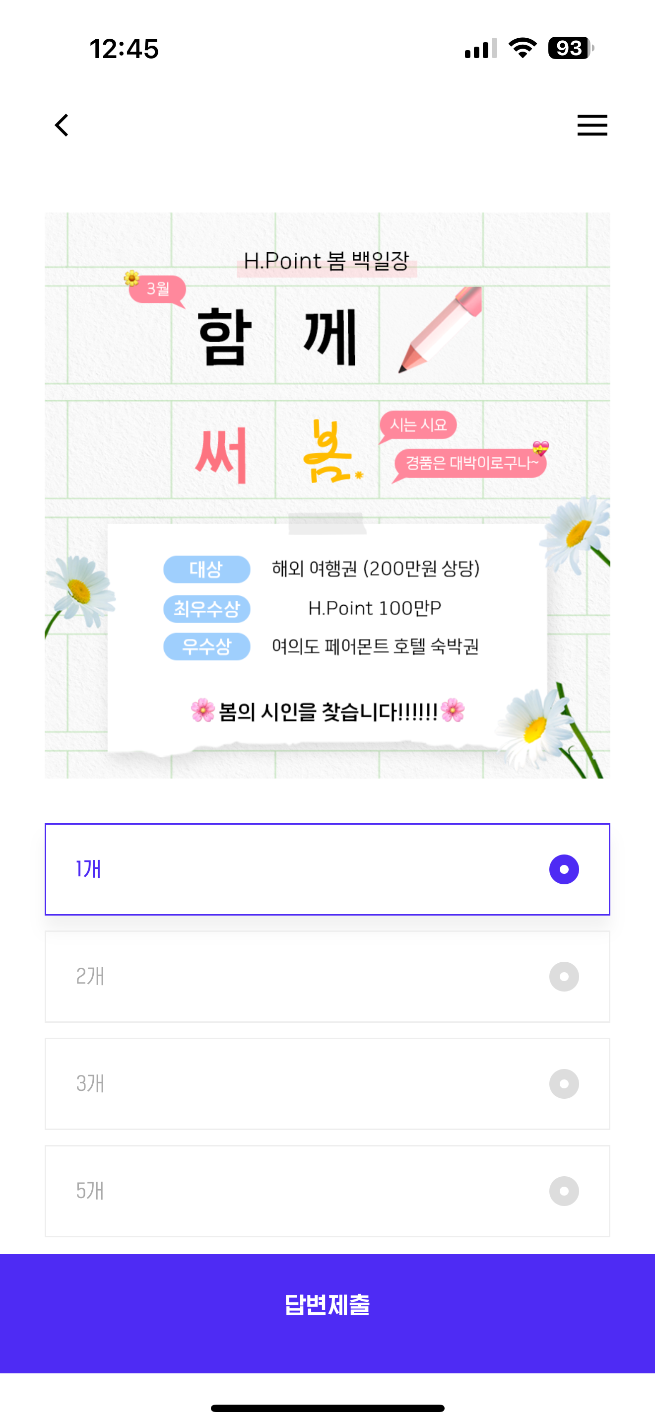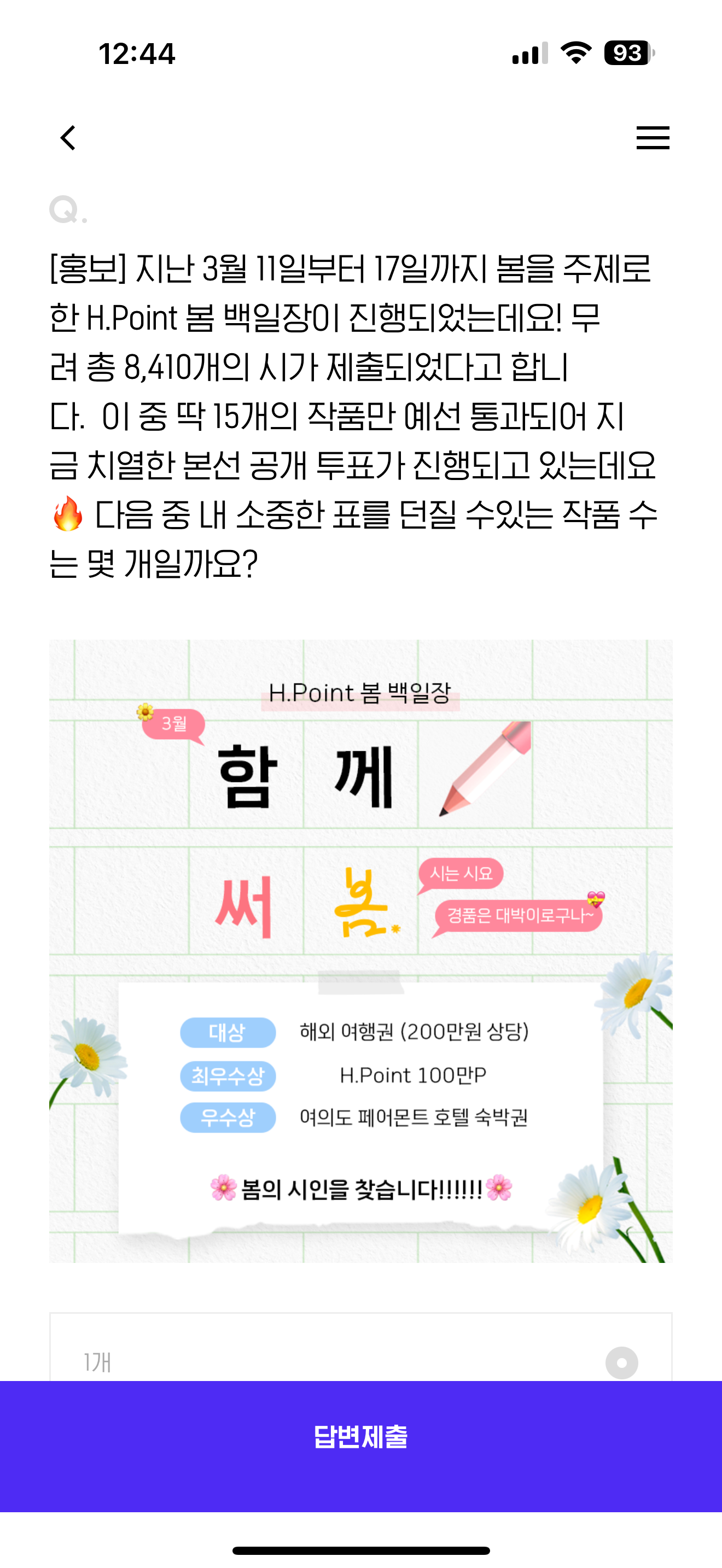 지난 3월 11일부터 17일까지 봄을 주제로 한 H.Point 봄 백일장이 진행되었는데요! 무려 총 8,410개의 시가 제출되었는데요! 무려 총 8,410개의 시가 제출되었다고 합니다. 이 중 딱 15개의 작품만 예선 통과되어 지금 치열한 본선 공개 투표가 진행되고 있는데요. 디음 중 내 소중한 표를 던질 수 있는 작품 수는 몇 개일까요? 보기는 1. 1개 2. 2개 3. 3개 4. 5개 입니다.