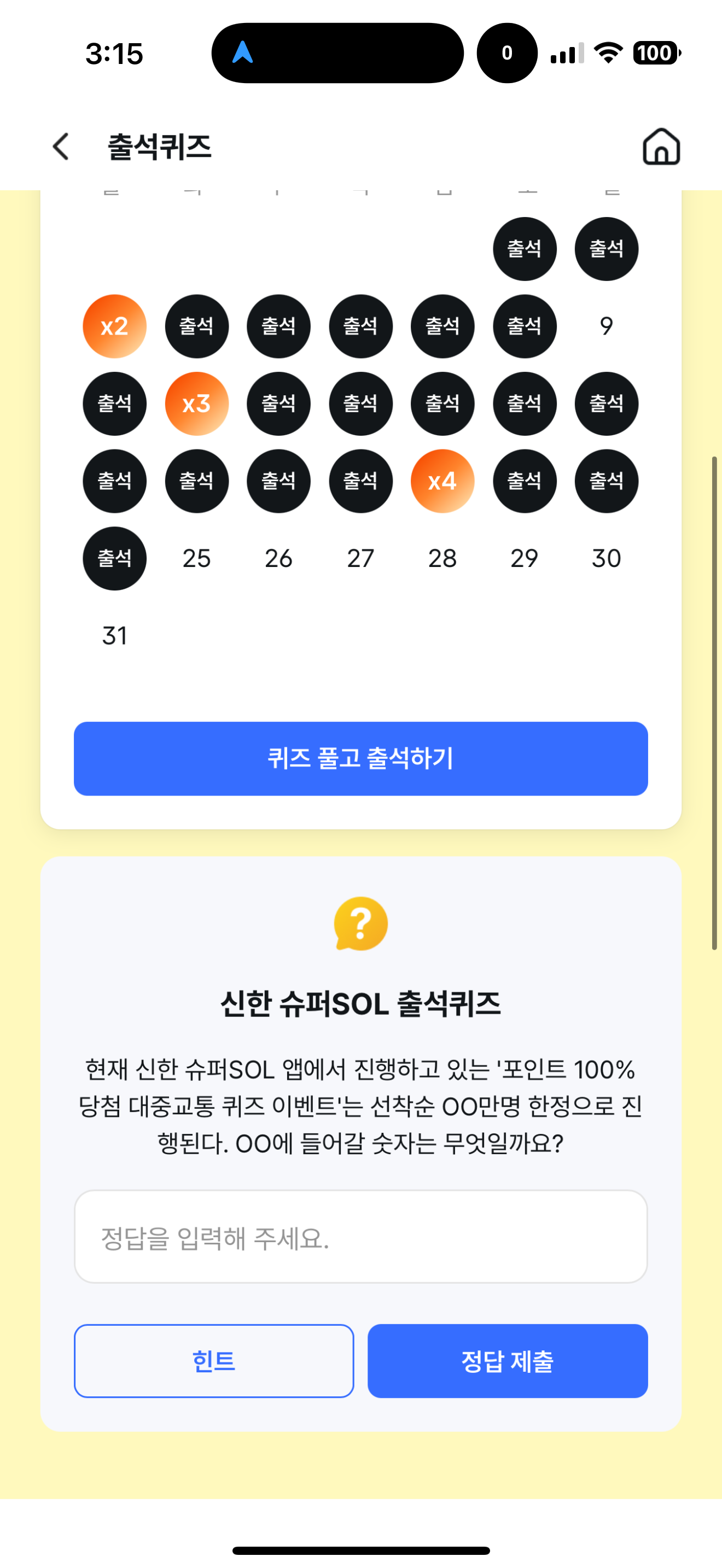 현재 신한 슈퍼SOL 앱에서 진행하고 있는 '포인트 100% 당첨 대중교통 퀴즈 이벤트'는 선착순 OO만명 한정으로 진행된다. OO에 들어갈 숫자는 무엇일까요? 주관식 퀴즈인데요. 100% 당첨되는 대중교통 퀴즈 이벤트입니다. 포인트를 받을 수 있으니 꼭 도전해 보세요