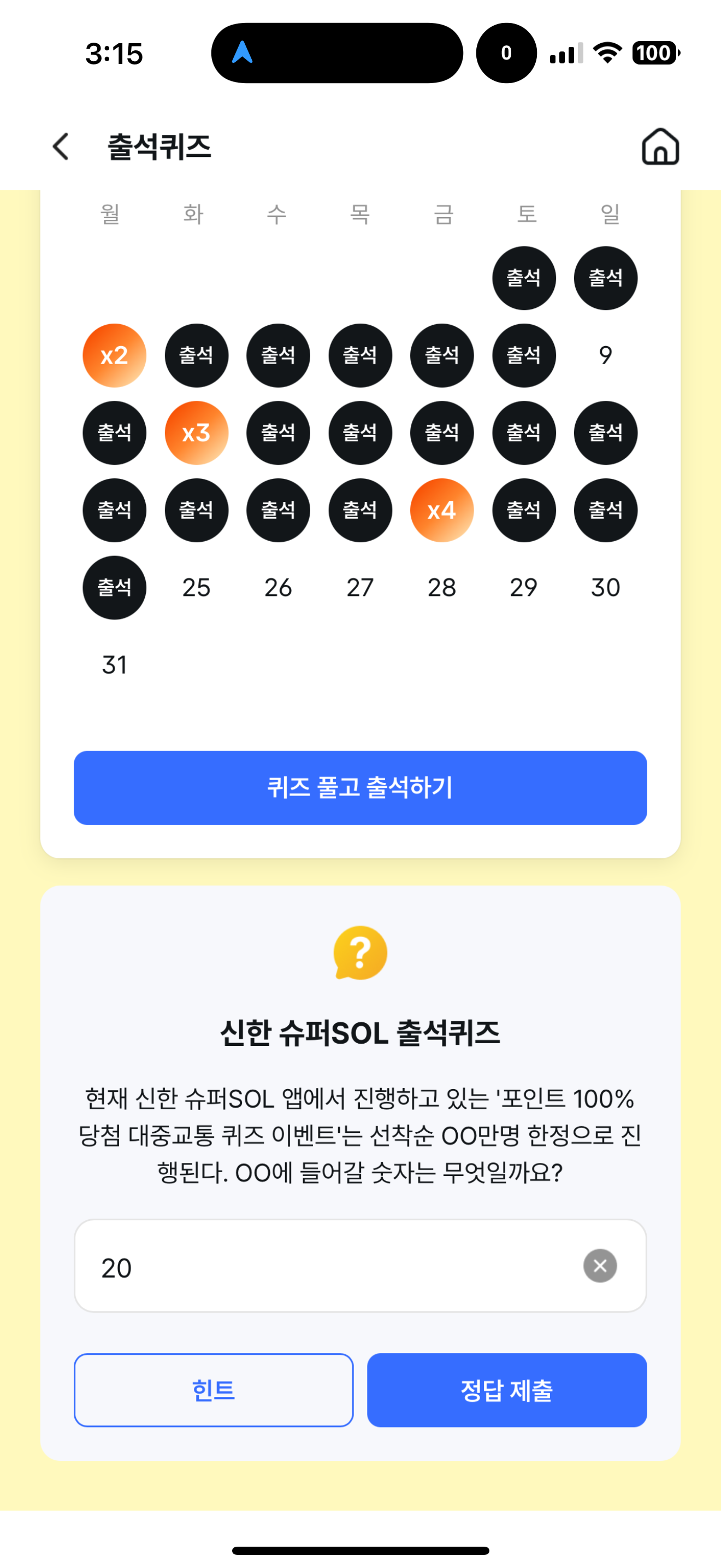 신한 슈퍼SOL 출석퀴즈 정답은 20 입니다