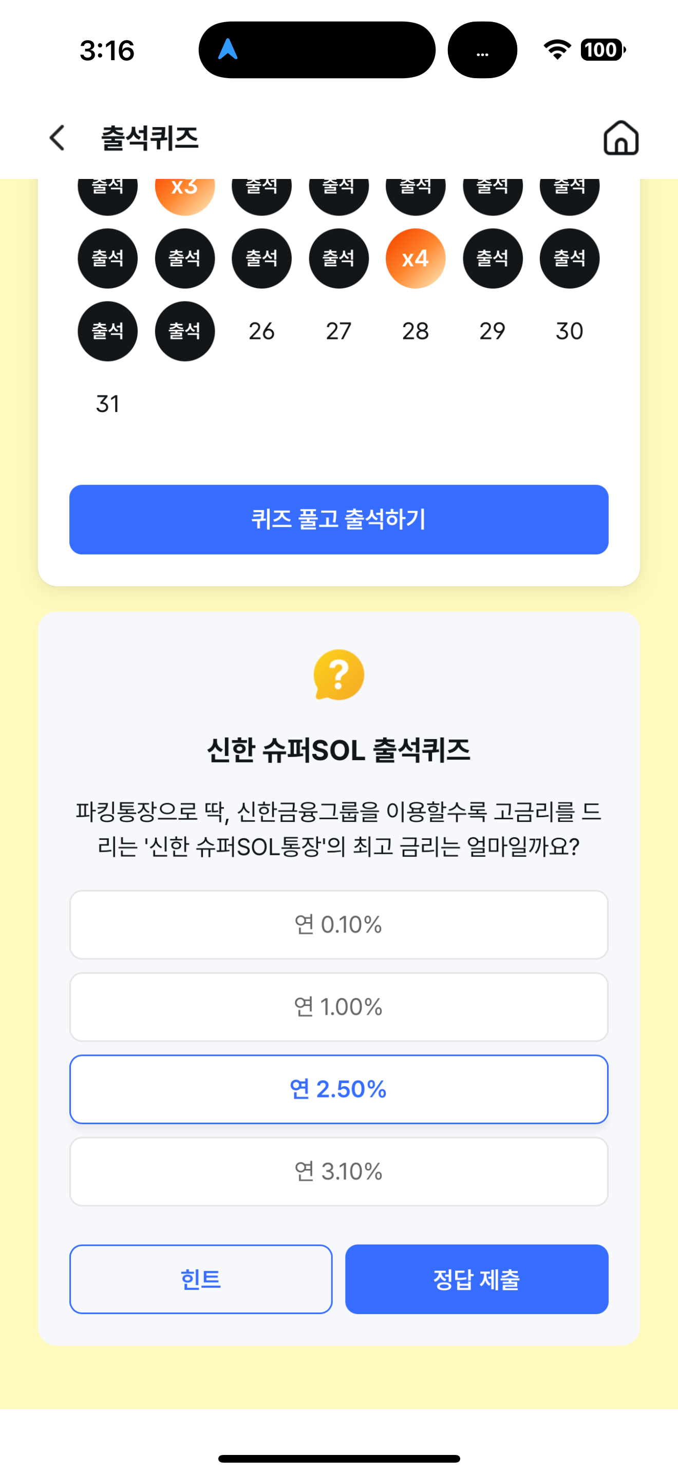 신한 슈퍼SOL 출석퀴즈 정답은 연 2.50% 입니다