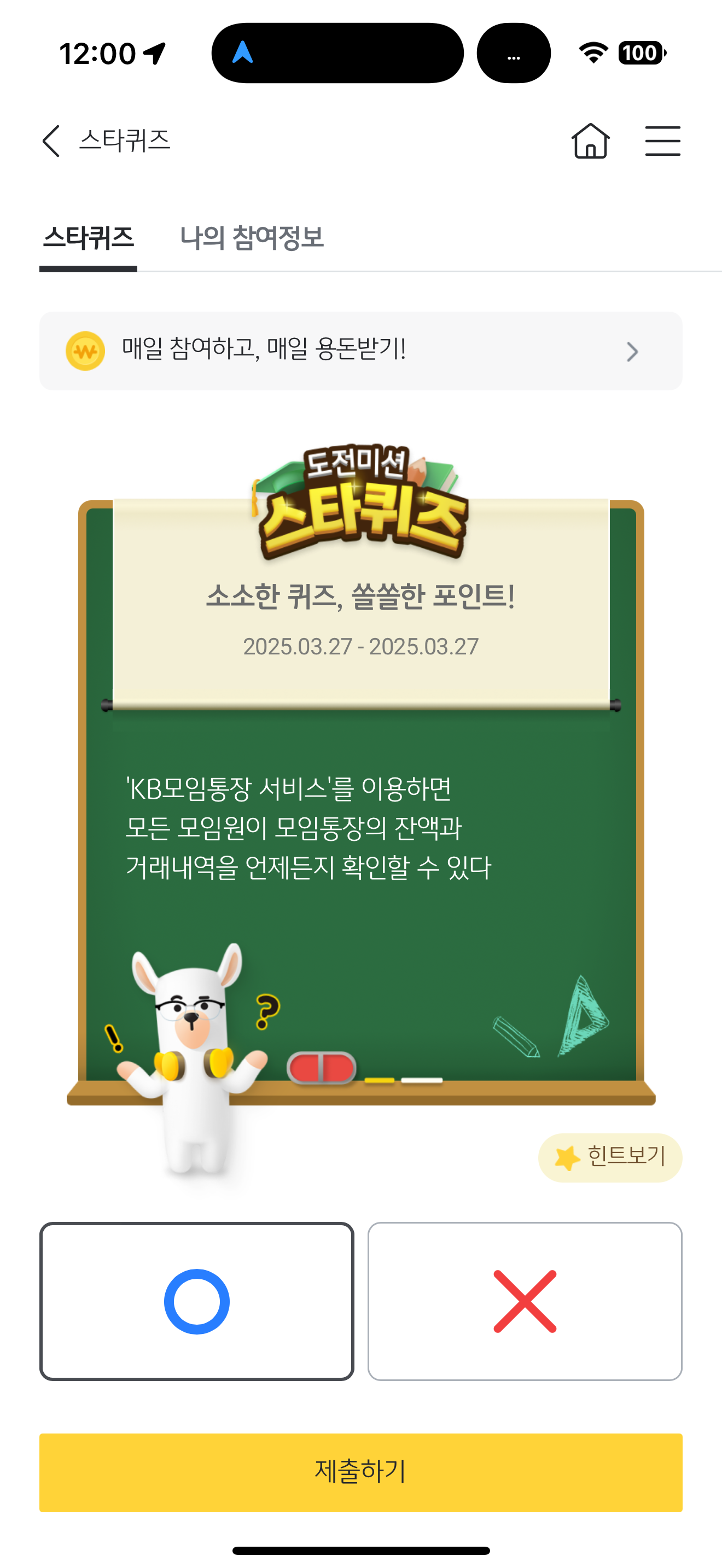 KB스타뱅킹 스타퀴즈 정답은 O 입니다